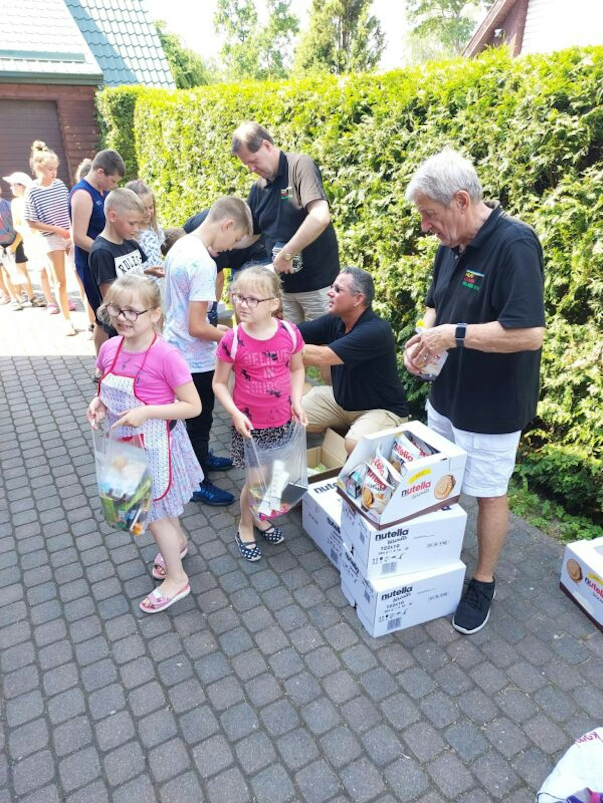Noch vor dem Abendessen wurde abgeladen: Rollstühle, Rollatoren, Unterarmgehstöcke, Kopierpapier, Kartons mit Kleidung, Stapelstühle, Waschpulver, Nähmaschinen, Stoffe und vieles mehr. „Für die Kinder haben wir Süßigkeiten mitgenommen, welche wir verteilen“, so Dirk Ballsieper: „Die glänzenden Kinderaugen und das unbekümmerte Lächeln sind der größte Dank. Diesen reichen wir hiermit gerne an unsere Spender und Helfer weiter.“ Martin Gürster nickt zustimmend. Der 16-Jährige hat den Hilfstransport nach Marijampole bereits zum dritten Mal begleitet.