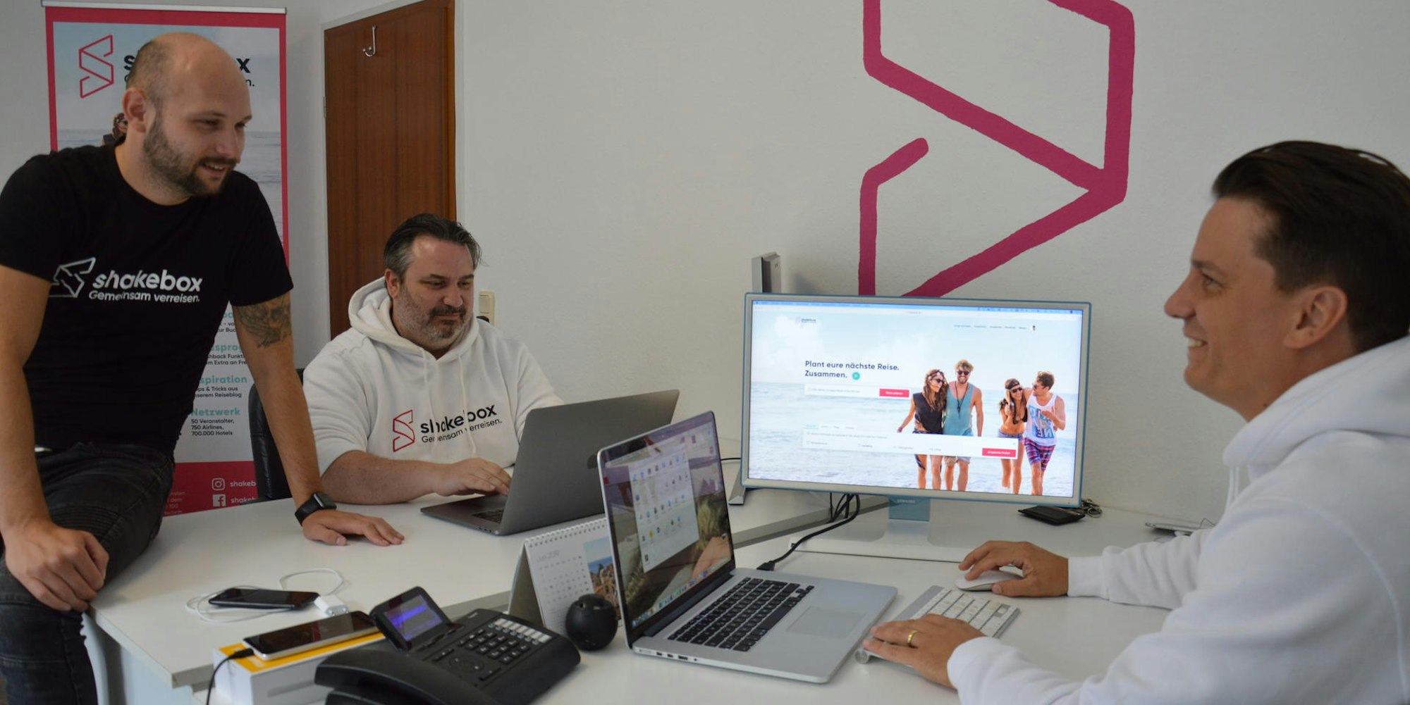 Das Startup nutzt ein Büro in Refrath, über dem Refrather Reisebüro, das Schumachers Vater Hans-Rudolf Schumacher gegründet hat. Er ist ebenfalls Gesellschafter der Shakebox GmbH. Mit fünf Arbeitsplätzen reicht die Bürofläche gerade aus. Fünf Köpfe sind fast versenkt hinter großen Monitoren und Laptops. Neben Timo Schumacher, Alexander und Michael Baum haben dort auch Elena Schneider, Auszubildende zur Reiseverkehrskauffrau, und eine Praktikantin einen Arbeitsplatz.