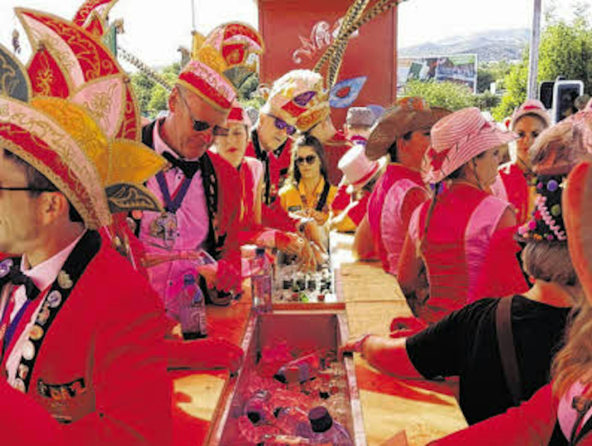 Natürlich empfing auch Windhuks Bürgermeister die Delegation der Großen Gladbacher und nahm die fünf Jecken gleich mit auf den Festwagen, um sich mit den Besuchern in den Karnevalsumzug durch Windhuk einzureihen. Wegen der Hitze wurden die Getränke auf dem Festwagen gekühlt, während das Wurfmaterial auf die Zuschauer am Zochweg niederprasselte – darunter auch Waffelriegel mit dem Emblem der Großen Gladbacher. Die hatte Markus Sprenger eigens mitgebracht. Beim anschließenden Frühschoppen trafen die Gladbacher Bauer Gerald aus der RTL-Reihe „Bauer sucht Frau“ – auch er kannte offenbar den Geheimtipp des Windhuker Karnevals. (wg)