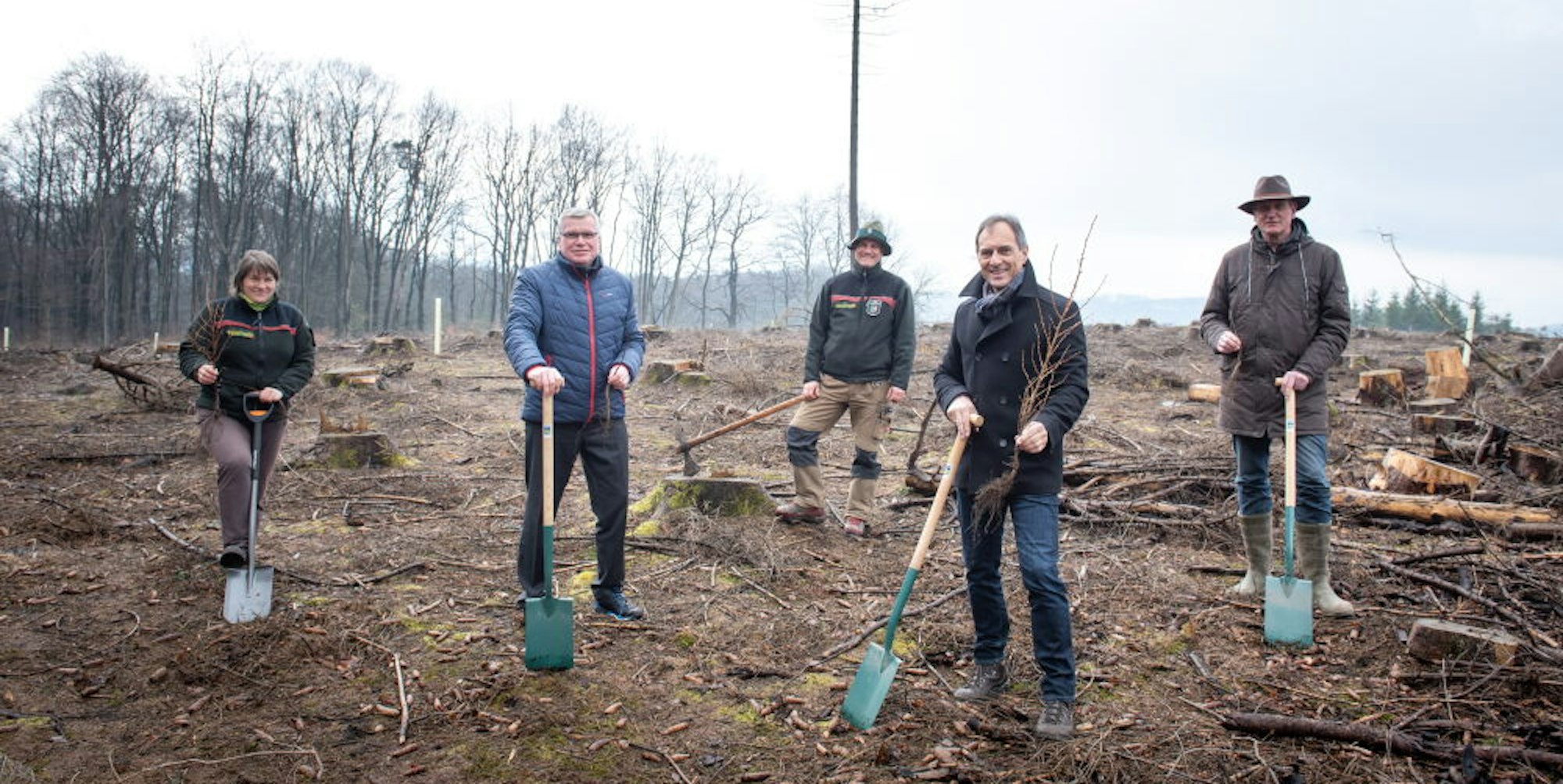 Bäume für die Zukunft pflanzten (v.l.) Christina Amling (Wald und Holz NRW), Achim Südmeier (Rhein-Energie), Raik Gröning (Leiter Forstbetriebsbezirk Kürten, Manfred Habrunner (Belkaw) und Gerhard Naendrup (Schutzgemeinschaft Deutscher Wald).