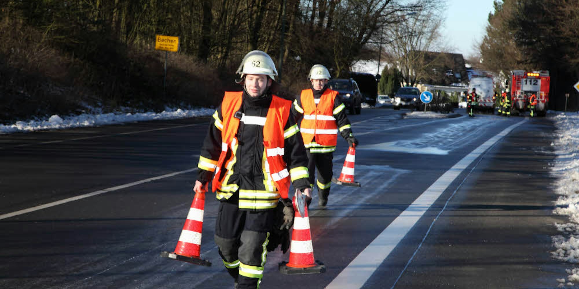 Auch das Abstreuen von ausgelaufenem Öl bei Verkehrsunfällen gehört zu den Aufgaben der Wehr. Hier sind Mitglieder der Löschgruppe Bechen auf der Kölner Straße im Einsatz.