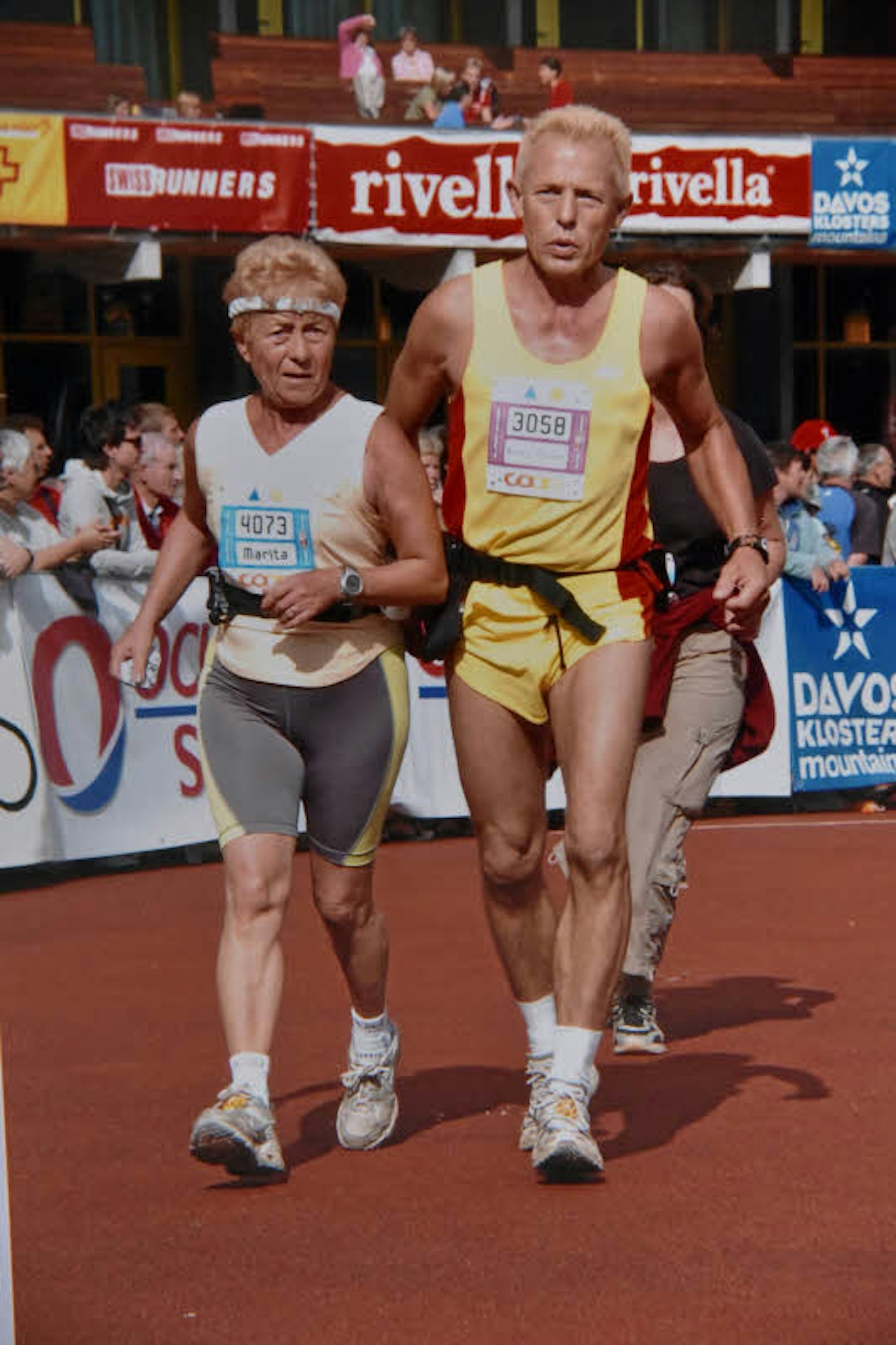 Zieleinlauf 1996 beim Swiss Alpine-Lauf in Davos, gemeinsam mit Ehefrau Marita.