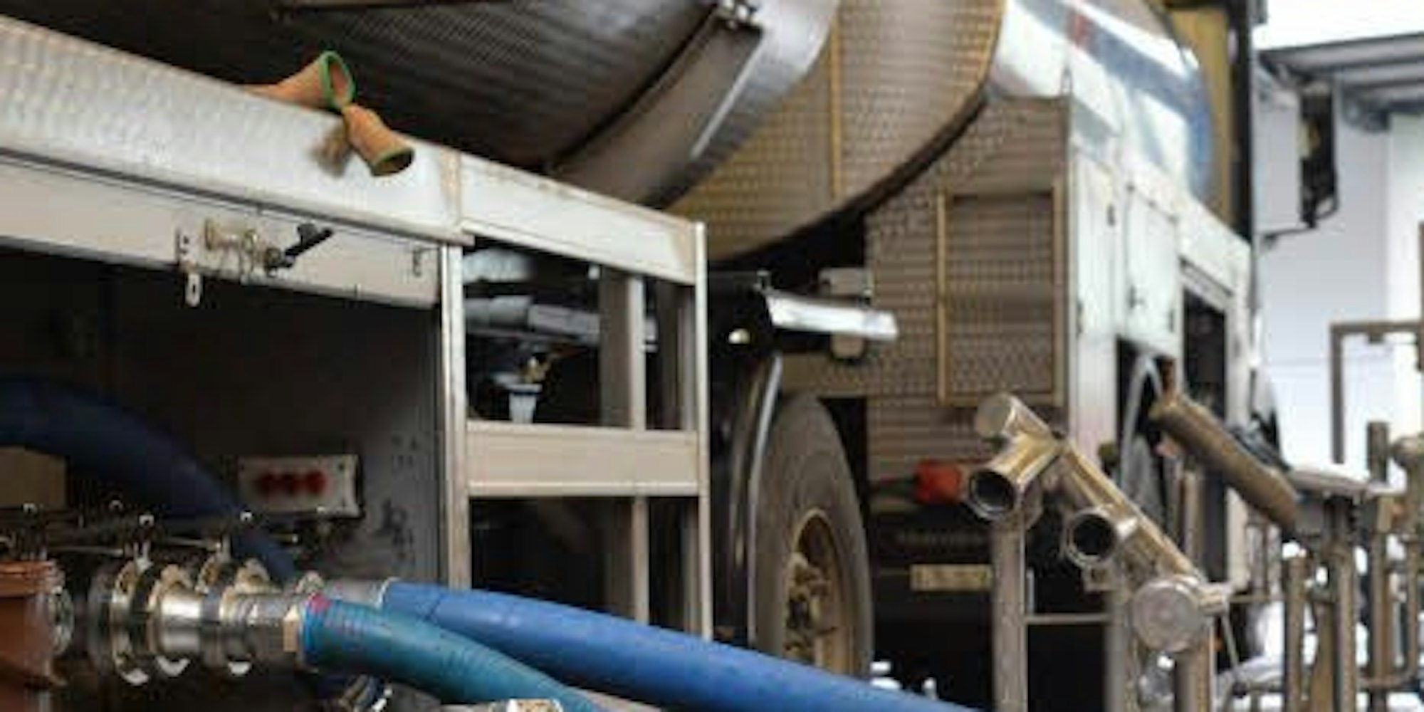 Die Milch wird aus dem Laster in einen der acht Edelstahlsilos gepumpt, die neben der Abtankstraße auf dem Hof stehen. Jeder Tank ist 21 Meter hoch und hat ein Fassungsvermögen von 240 000 Liter. Von hier aus wird die Milch über eine Edelstahlverrohung ins Werk gepumpt.
