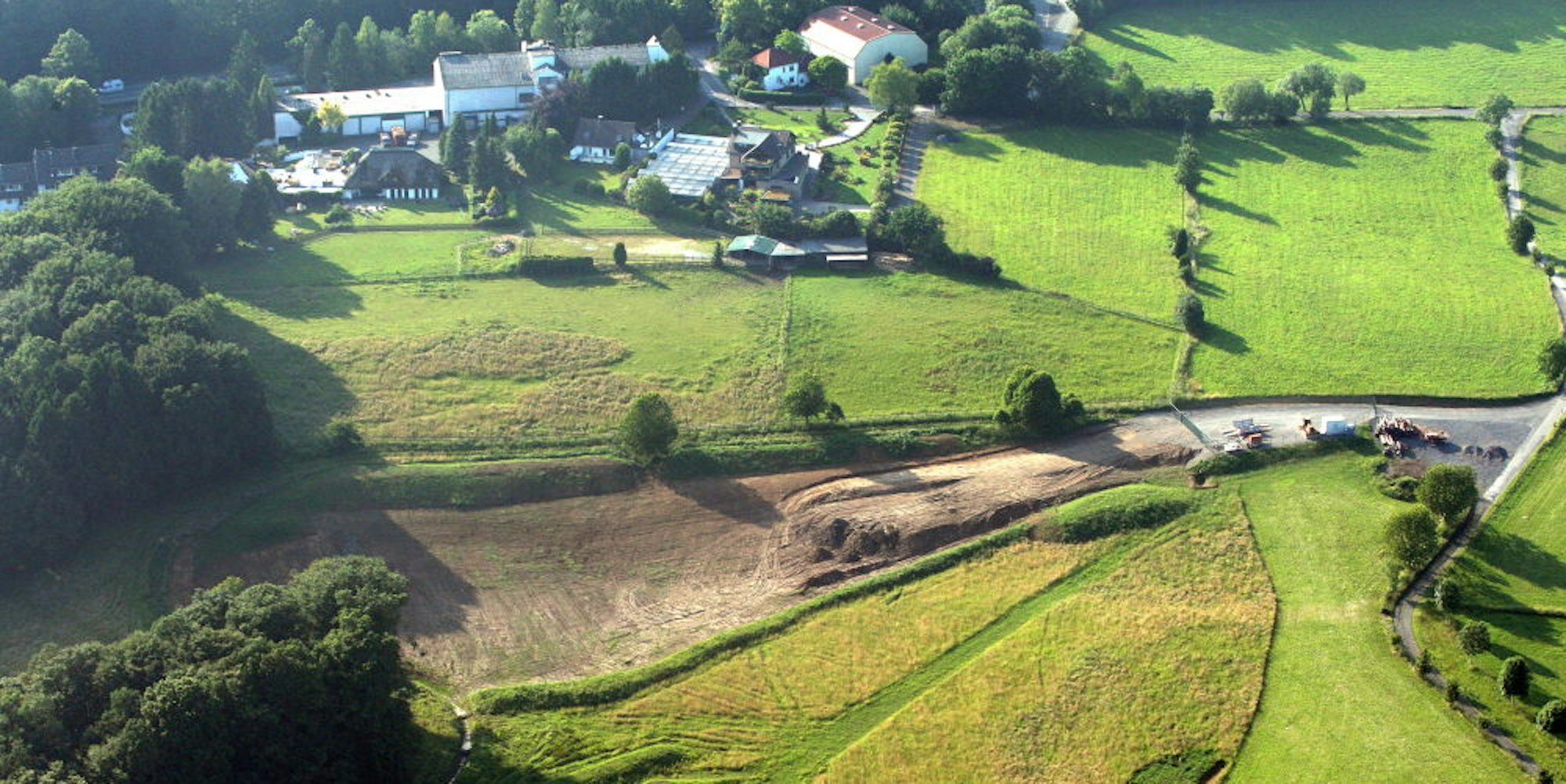 Die Erddeponie aus der Vogelperspektive. Oben am Bildrand ist die Ortslage Herrscherthal zu erkennen.