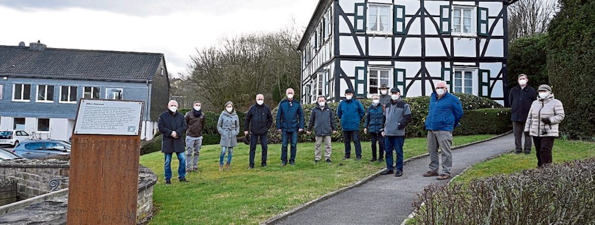 Treff an der Stele vorm Pastorat in Kürten: (v.l.) Bürgermeister Willi Heider, Sascha Amthor, Stefanie Kurth (beide IG Kürten), Rainer Stahlke, Willi Meyer (beide IG Bechen), Hans Reck, Norbert Grothoff, Barbara Müller, Bernd Weber , Kunibert Förster (alle Geschichtsverein), Michael Iwanzik (BIG Olpe).