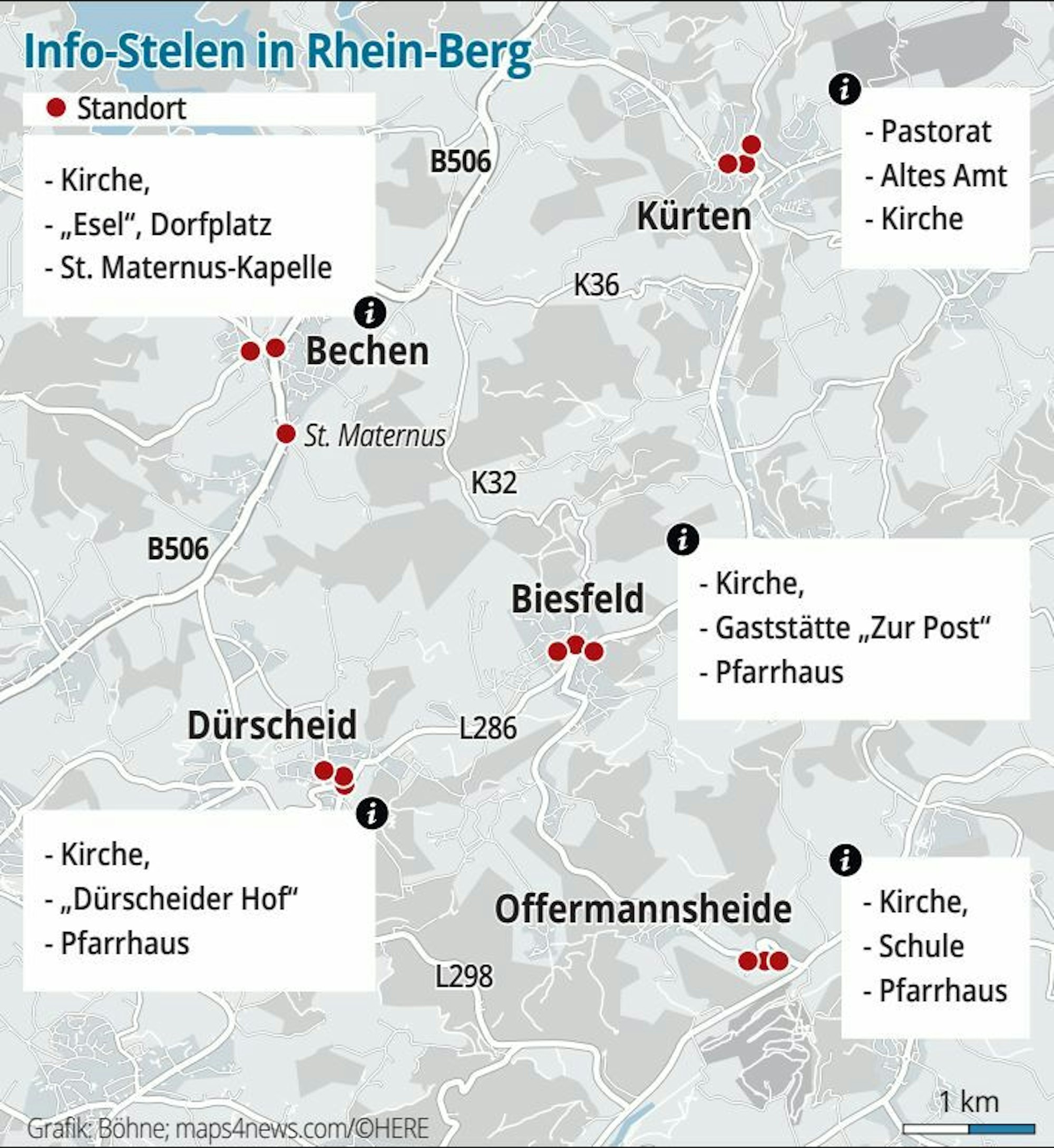 Nachzulesen ist der Bericht vom Hausbau Anno 1771 auf der neuen Denkmal-Stele am Pastorat. Überall sind in den vergangenen Wochen in den Kürtener Kirchdörfern diese Hingucker aufgestellt worden, zu übersehen sind sie nicht. 15 Stück insgesamt, je drei in Kürten, Bechen, Biesfeld, Dürscheid und Offermannsheide. Prägnante Texte führen in die Ortsgeschichte ein, die in der frühen Neuzeit auch immer eine Kirchengeschichte gewesen ist.