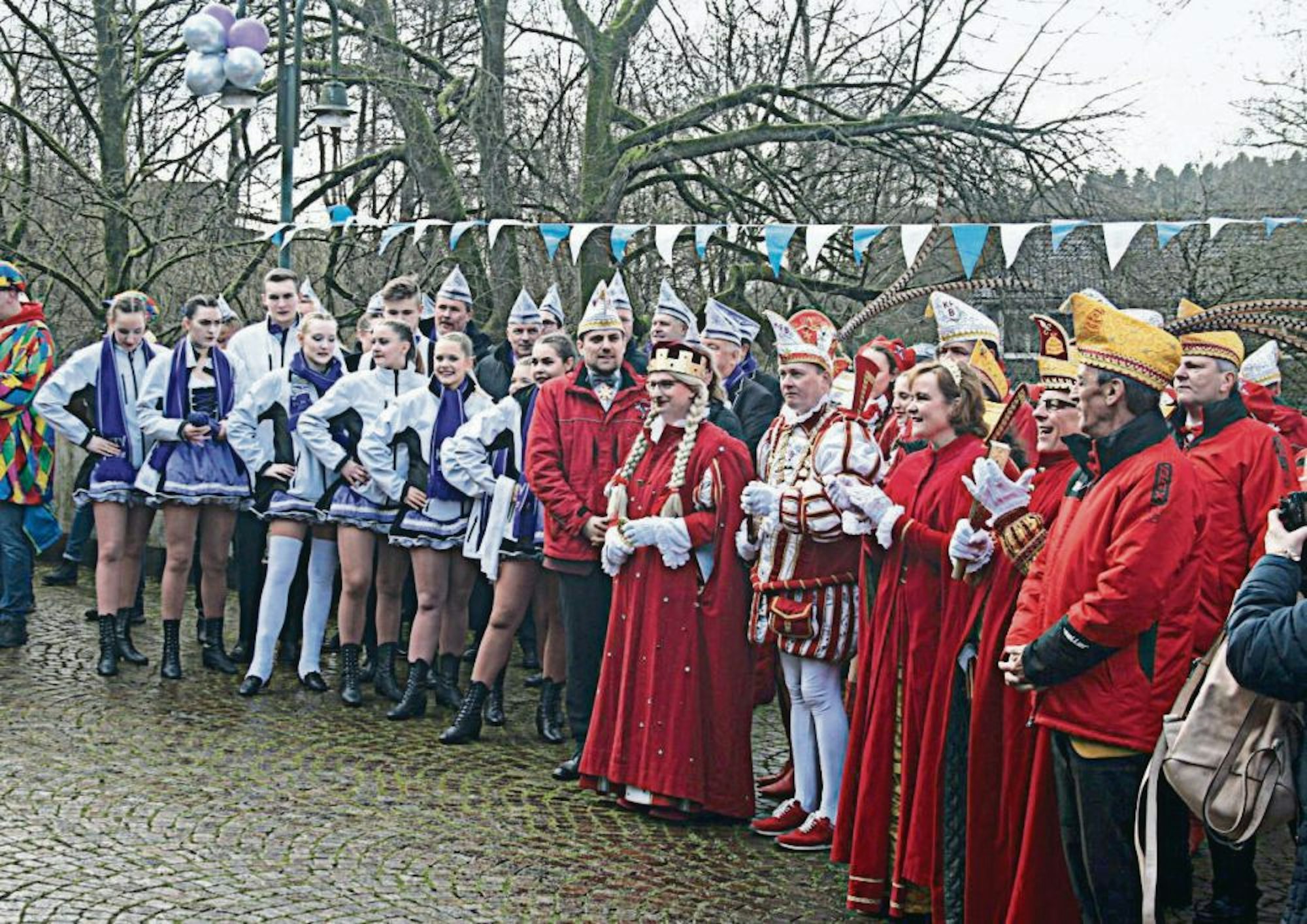 Dann legte Wilfried Fischer von den Dürscheder Mellsäck los: Alle Jecken nach vorne und ran an den Bürgermeister. Auf der Treppe unterstützten Stefan Utsch von den Karnevalsfreunden Bechen und Peter Adelt vom Kürtener Karnevalsverein KKV, das Dürscheider Prinzenpaar Dieter I. und Marita II., Prinz Marc I. und Jungfrau Uli aus Bechen (Bauer Ralf ist erkrankt).