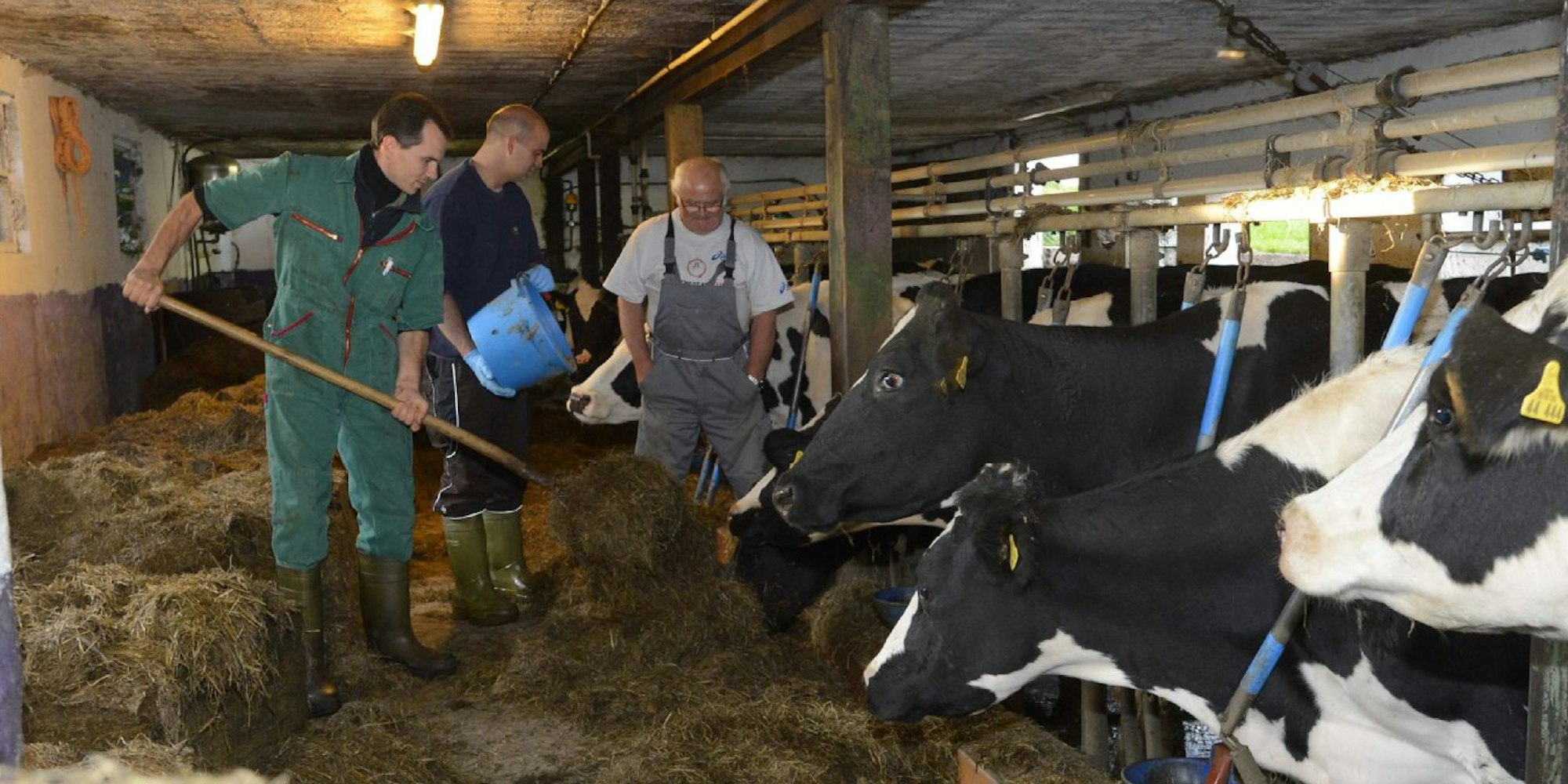 Nico Beckers-Schwarz, Jörg und Rainer Biesenbach (v. l.) im Stall.
