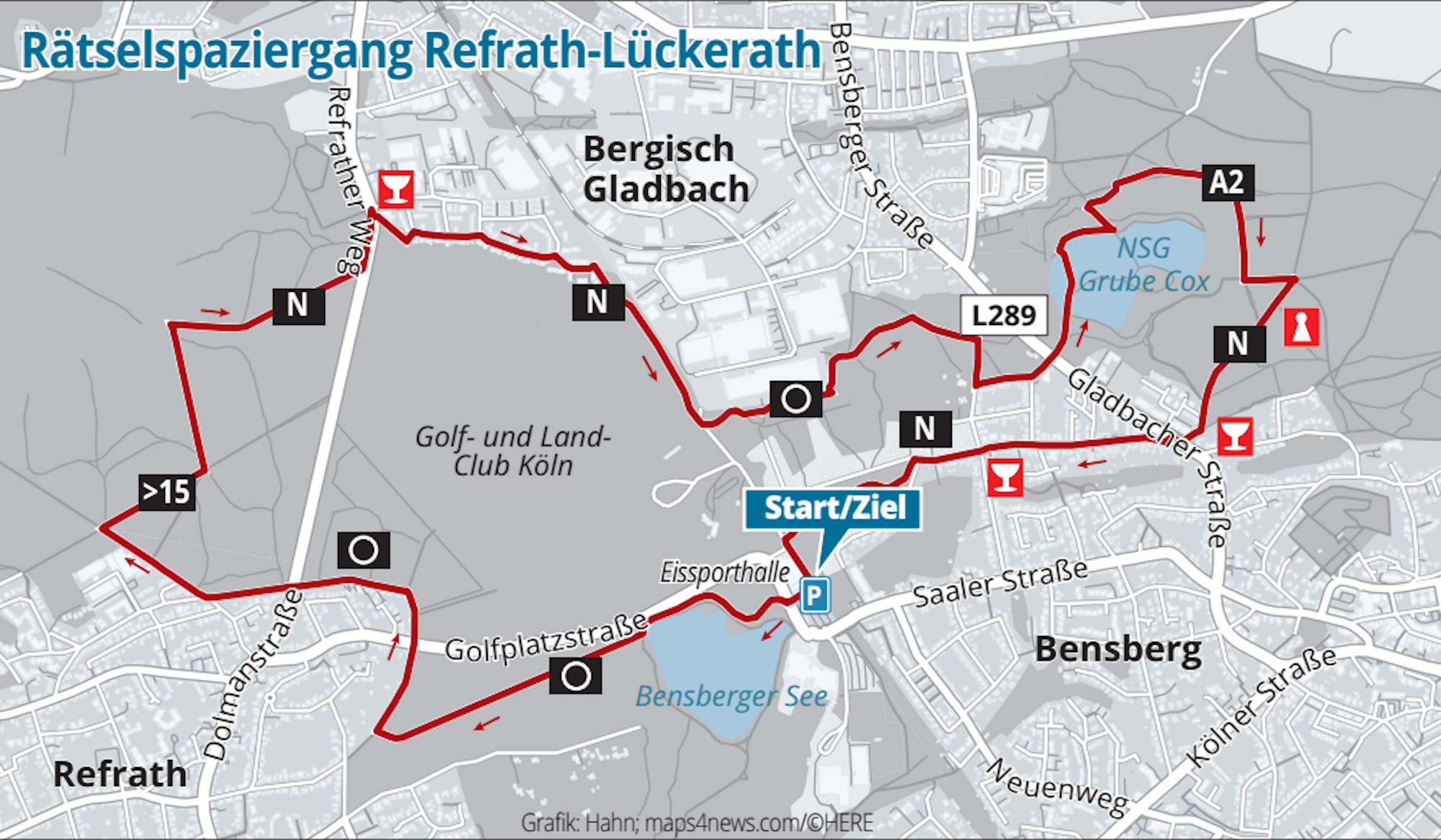 Rhein-Berg – Kalt, aber trocken: Das Wetter lädt zum Spazieren ein – und ein weiterer Advent unter Corona-Bedingungen zur Bewegung an der frischen Luft. Dazu setzt die Redaktion ihre Rätselspaziergänge fort. Sie bieten Tourenvorschläge, Sehenswertes am Wegesrand und obendrein noch die Möglichkeit etwas zu gewinnen. Los geht's mit einer Tour durch die grüne Mitte der Kreisstadt zwischen Refrath, Gronau und Lückerath. Und Sie haben Zeit. Einsendeschluss für das Lösungswort ist nach einer Verlängerung wegen der großen Nachfrage in den Schulferien erst am Dienstag, 11. Januar 2022.
