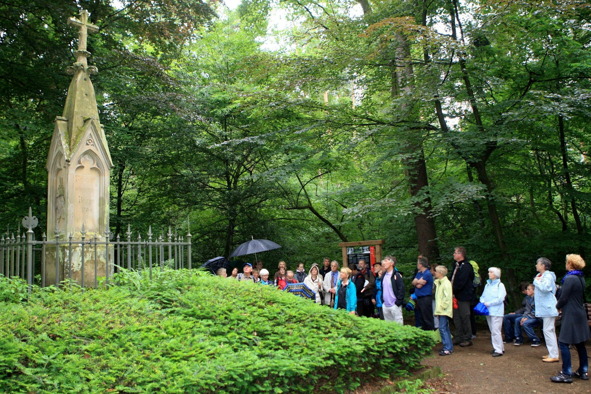Wir folgen dem breiten Weg ca. 650 Meter, biegen dann an einer Kreuzung links ab und nehmen an der nächsten den ersten Weg rechts. Nach wenigen Metern geht’s links zu einem Denkmal für hier bestattete Soldaten. Daneben steht eine Infotafel des Bensberger Schlosswegs. Vom groß gedruckten Zitat schauen wir uns das letzte Wort an und notieren den vorletzten Buchstaben als neunten unseres Lösungsworts.