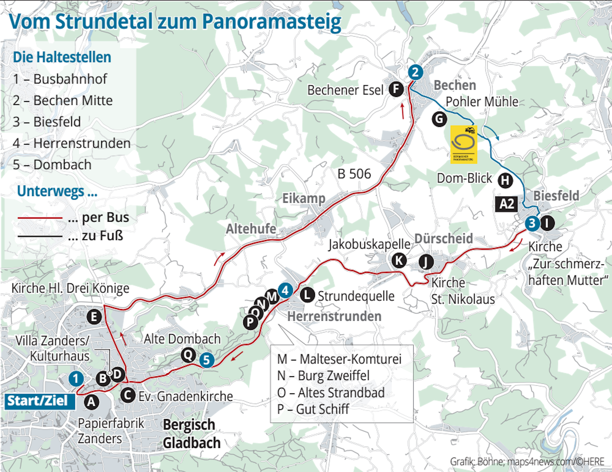 In Herrenstrunden lockt noch ein kurzer Ausstieg, vielleicht mit einem Bummel zur Strundequelle (L), einer Einkehr in der Malteser-Komturei (M) oder einer Ortsrunde zur Burg Zweiffel (N), zum Alten Freibad (O) oder zu Gut Schiff (P), dem heute landwirtschaftlich genutzten ehemaligen Verwaltungssitz von Schwarzpulvermühlen, von denen es früher einige gab im Tal der Strunde. An Gut Schiff ist auch die nächste Bushaltestelle, an der man wieder in den 426er einsteigen kann (unter der Woche um 14’, 34’, 54’, samstags um 24’ und 54’ und sonntags um 59’).