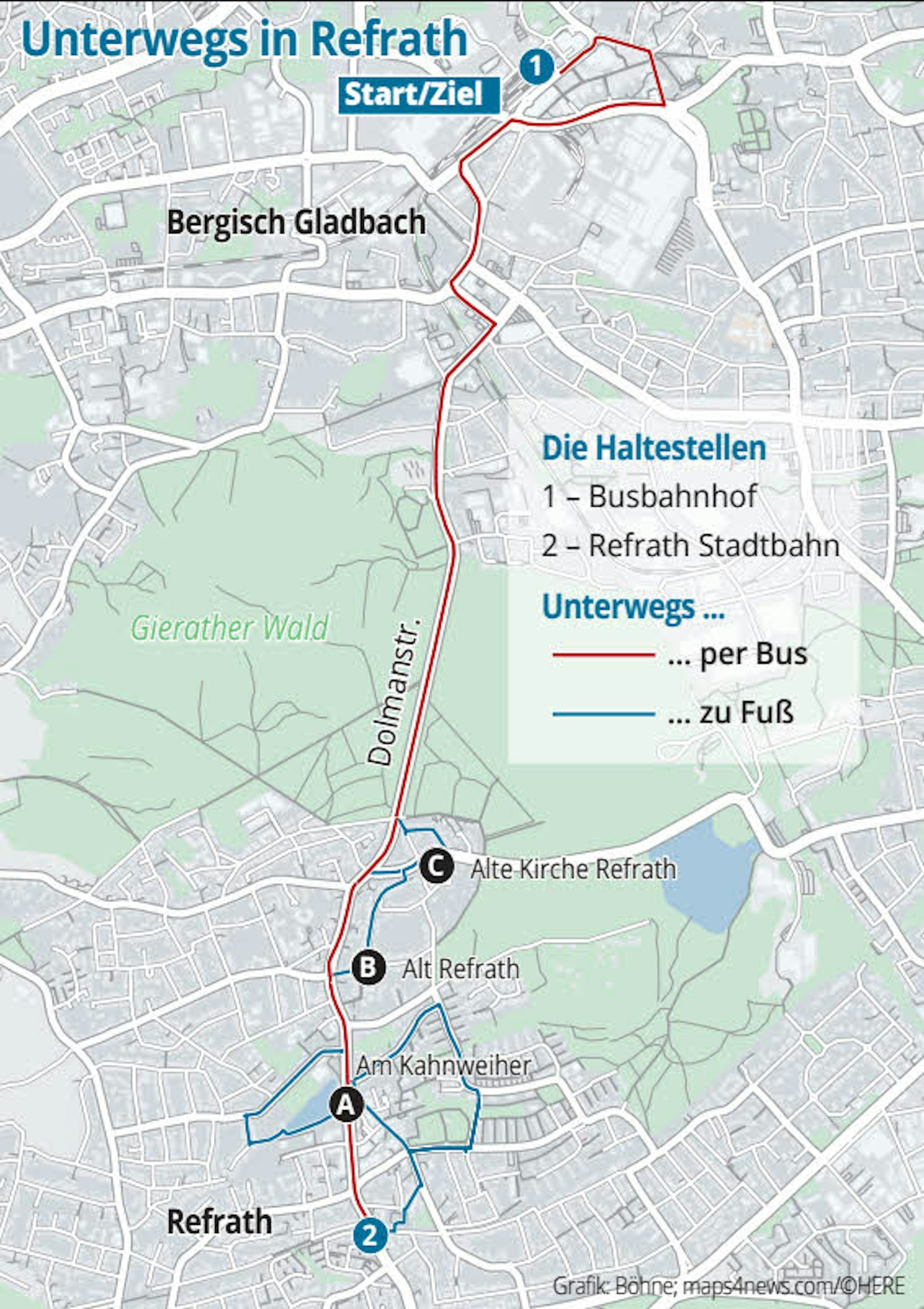 Rhein-Berg – Eine kleine Tour ist es diesmal, die wir mit dem Bus machen, es geht in den Bergisch Gladbacher Stadtteil Refrath, wo sich bei einer kleinen oder größeren Runde zu Fuß vieles entdecken lässt.