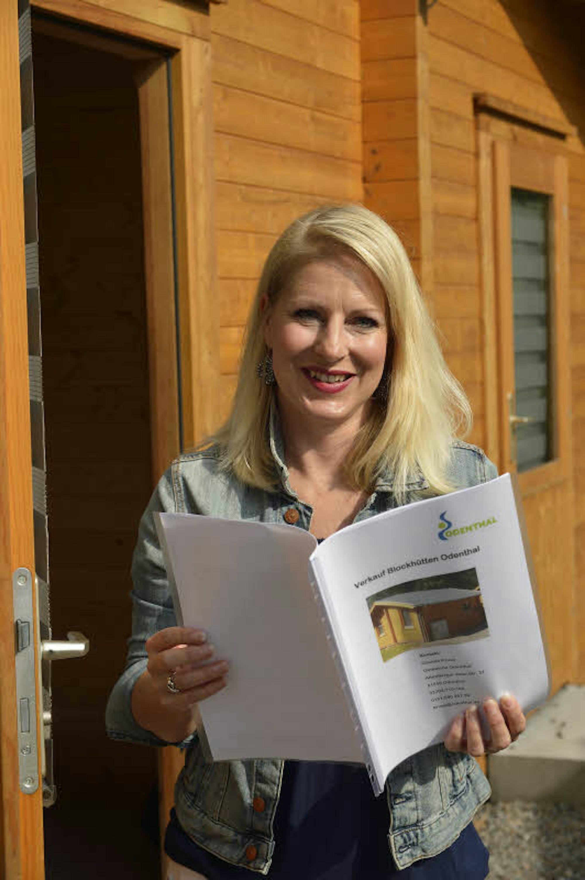 Claudia Kruse mit einem Exposé der zum Verkauf stehenden Häuser