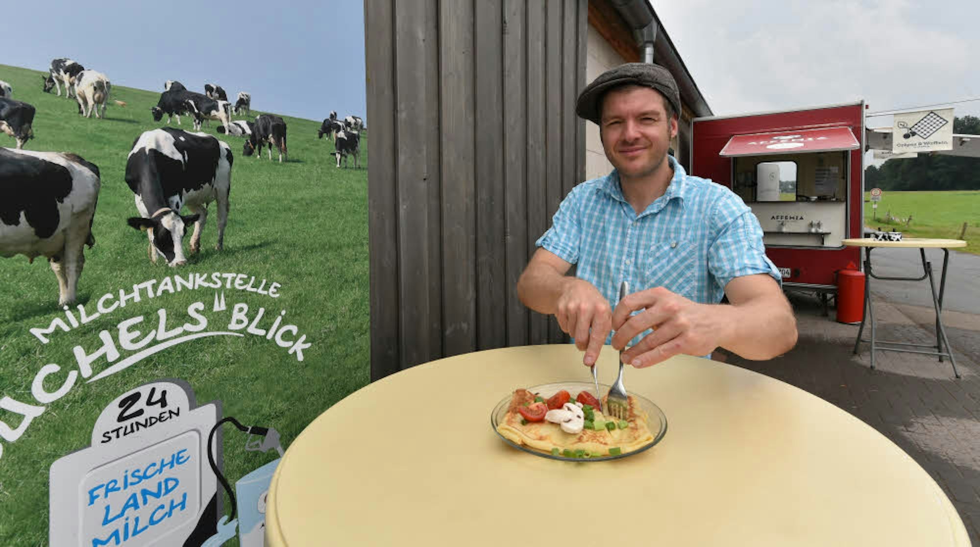 An der Milchtankstelle des Büchel-Hofs hat Torsten Dahl sein rotes „Affemia“-Mobil aufgebaut.