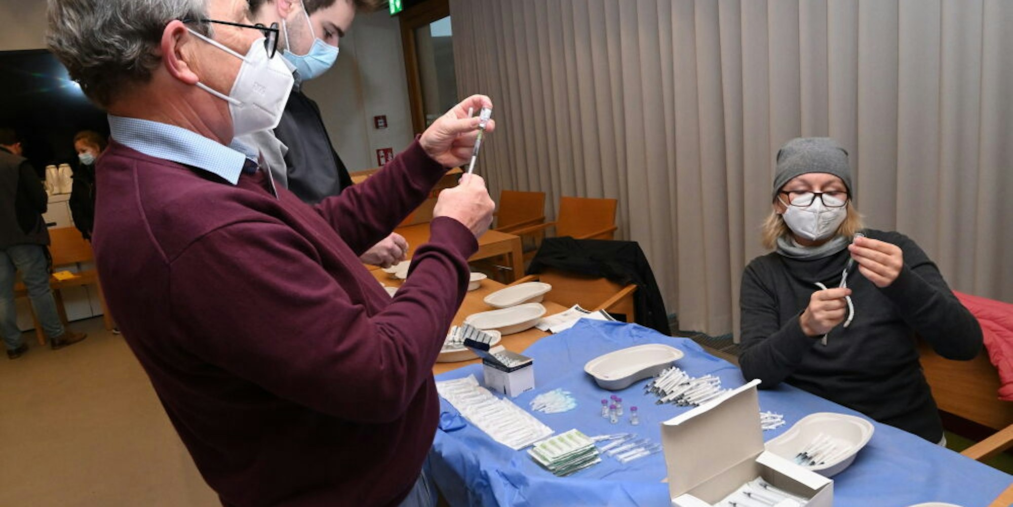 Vorbereitungen für mehr als 500 Impfungen: Dr. Heribert Wiemer (vorne) und sein Team ziehen Spritzen auf.
