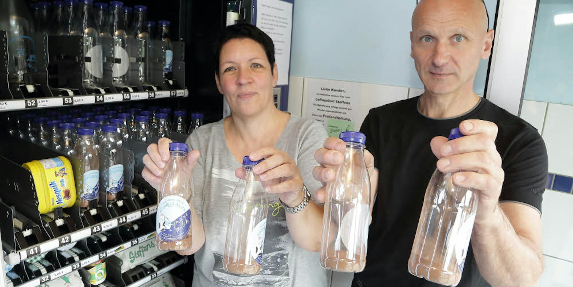 Mit Ehemann Peter ist sie nun dabei, die noch mit Kakaopulver gefüllten Flaschen aus dem Automaten zu nehmen und durch leere zu ersetzen. Denn „durch den Kakao in den Flaschen würden wir unsere Kunden zum Verzehr von Rohmilch verleiten“, zitiert Karin Büchel die Begründung des Umweltministeriums.