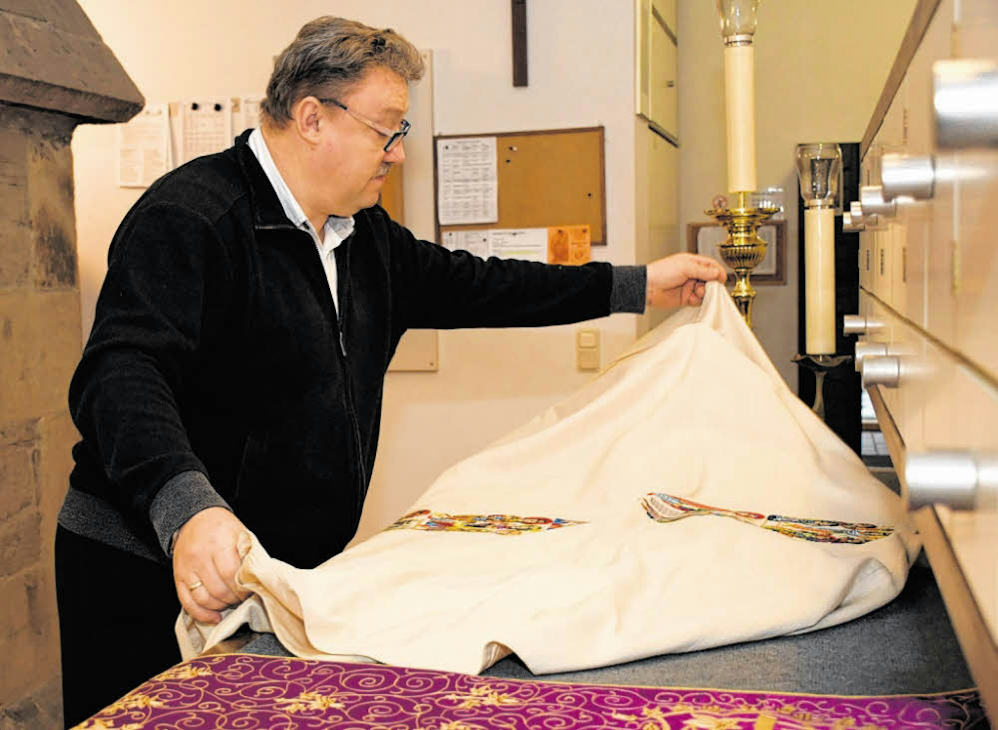 23 solcher Kerzenkränze müssen vorbereitet und hinaufgezogen werden, „die ungerade Zahl kommt zustande, weil wir am Tabernakel keinen Kerzenkranz aufhängen können“, erklärt Mainusch. Allein am ersten Feiertag werden die Kerzen für drei katholische, zwei evangelische Gottesdienste sowie zwei Konzerte angezündet, abgebrannte Lichter müssen ersetzt werden. Jedes Mal bedeutet das, dass ein Helfer hinauf muss, ein anderer den herabgelassenen Kranz richtet. Das geht nur Hand in Hand. Auch in der Sakristei gibt es viel zu tun, der Abendmahlskelch wird mit Wein gefüllt, die Hostien parat gelegt. Die Paramente, die Gewänder der Geistlichen, müssen zurechtgelegt werden.