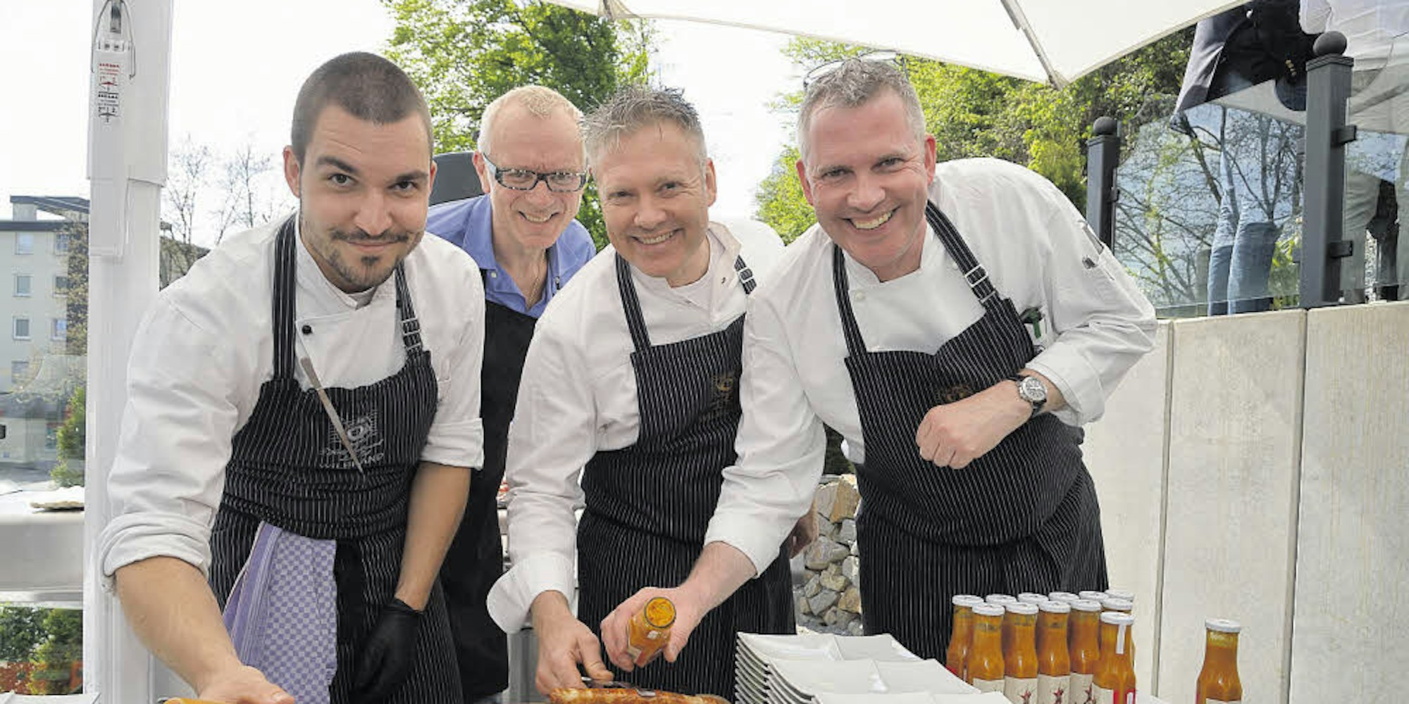 Auch Wolter hat einen Bezug zu Lerbach, wo sich Dieter Müller seine drei Sterne erkochte: Wolter und seine Frau Tanja haben sich dort bei der Arbeit kennengelernt. Joachim Kaiser, gerade erst als Koch des Jahres ausgezeichnet, stand auf der Terrasse und bot ein hervorragendes Dry Aged Beef an. Direkt daneben gab es die original Kebben-Wurst frisch vom Grill. „Der tut wirklich Fleisch rein“, machte Christopher Wilbrand seine Gäste neugierig auf die Currywurst von Willi Kebben aus Mönchengladbach. Normalerweise auf Kirmesplätzen vertreten, kam die Wildschweinwurst Thüringer Art mit der extra scharfer Soße auch bei den Sternschnupperern gut an.