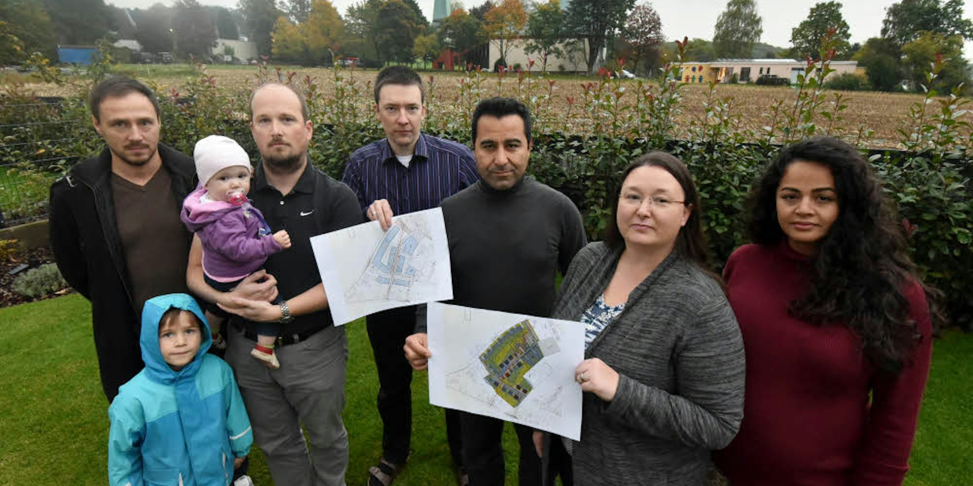 Andreas Duda, Jörg Zeutschel, Christian Reinermann, Ergün Gürcü, Melanie Barthum-Zeuschel, Camila Reinermann sowie die Kinder Tobias und Finja (v. l.) vor der Wiese, die bebaut werden soll