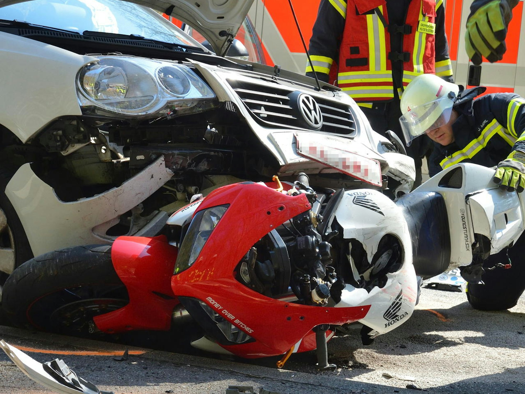 Erheblich verletzt worden ist der Fahrer dieses Motorrads, der bei Altenberg stürzte und unter ein Auto rutschte.