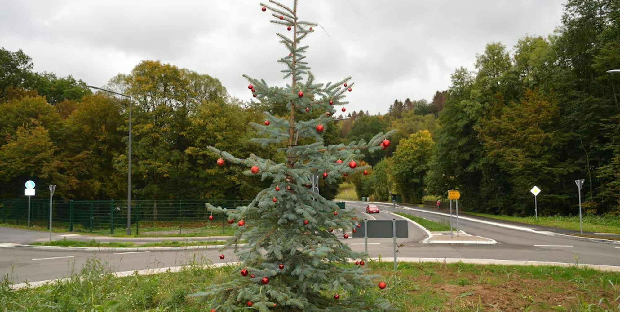 Eine Fichte, vorausschauend mit roten Weihnachtskugeln und Lichterkette liebevoll geschmückt, leuchtet den Autofahrern entgegen.