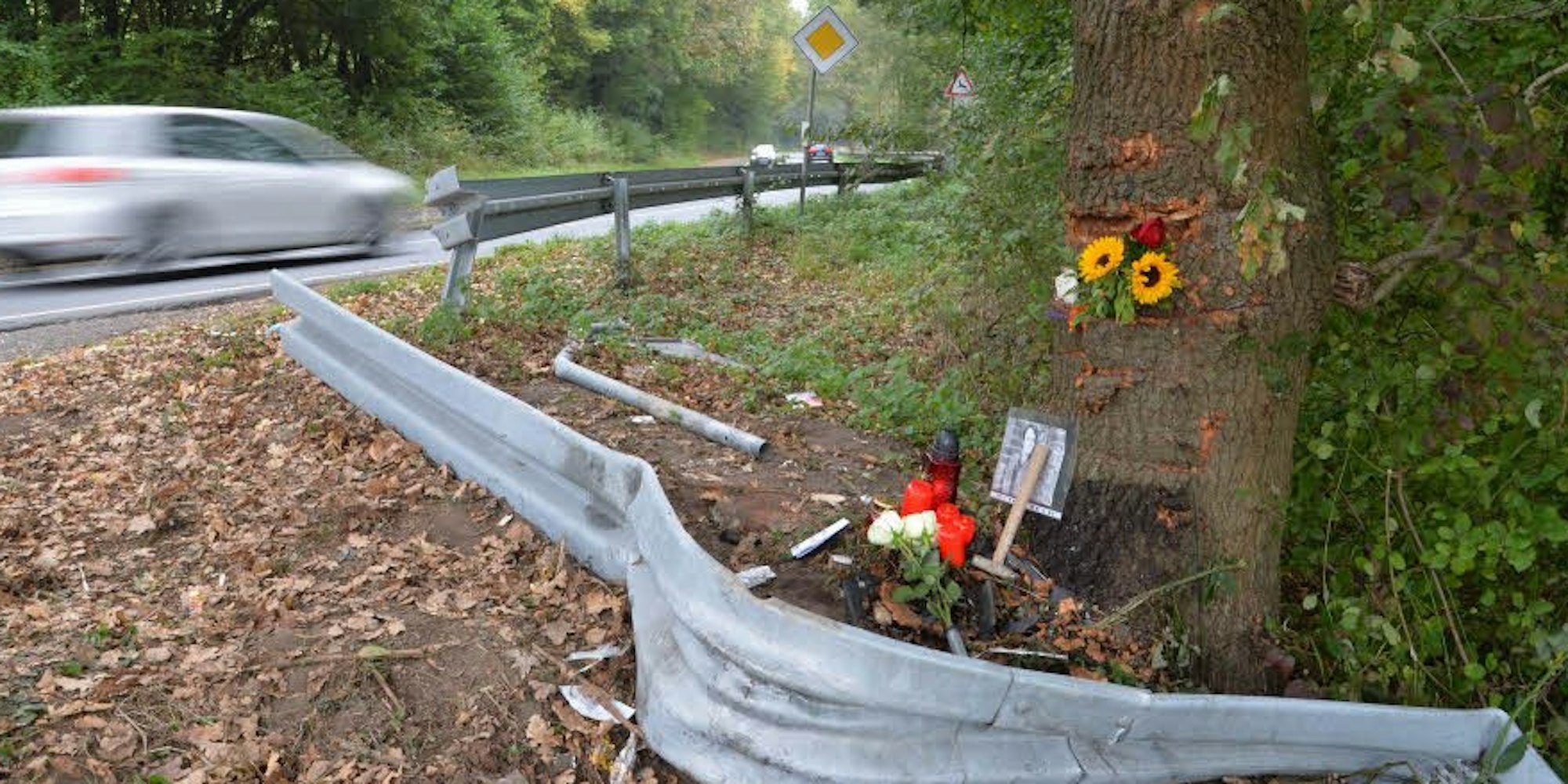 Am Baum sind noch die Spuren des Aufpralls zu sehen. Freunde haben Blumen, Kerzen und ein Bild des tödlich Verunglückten aufgestellt.