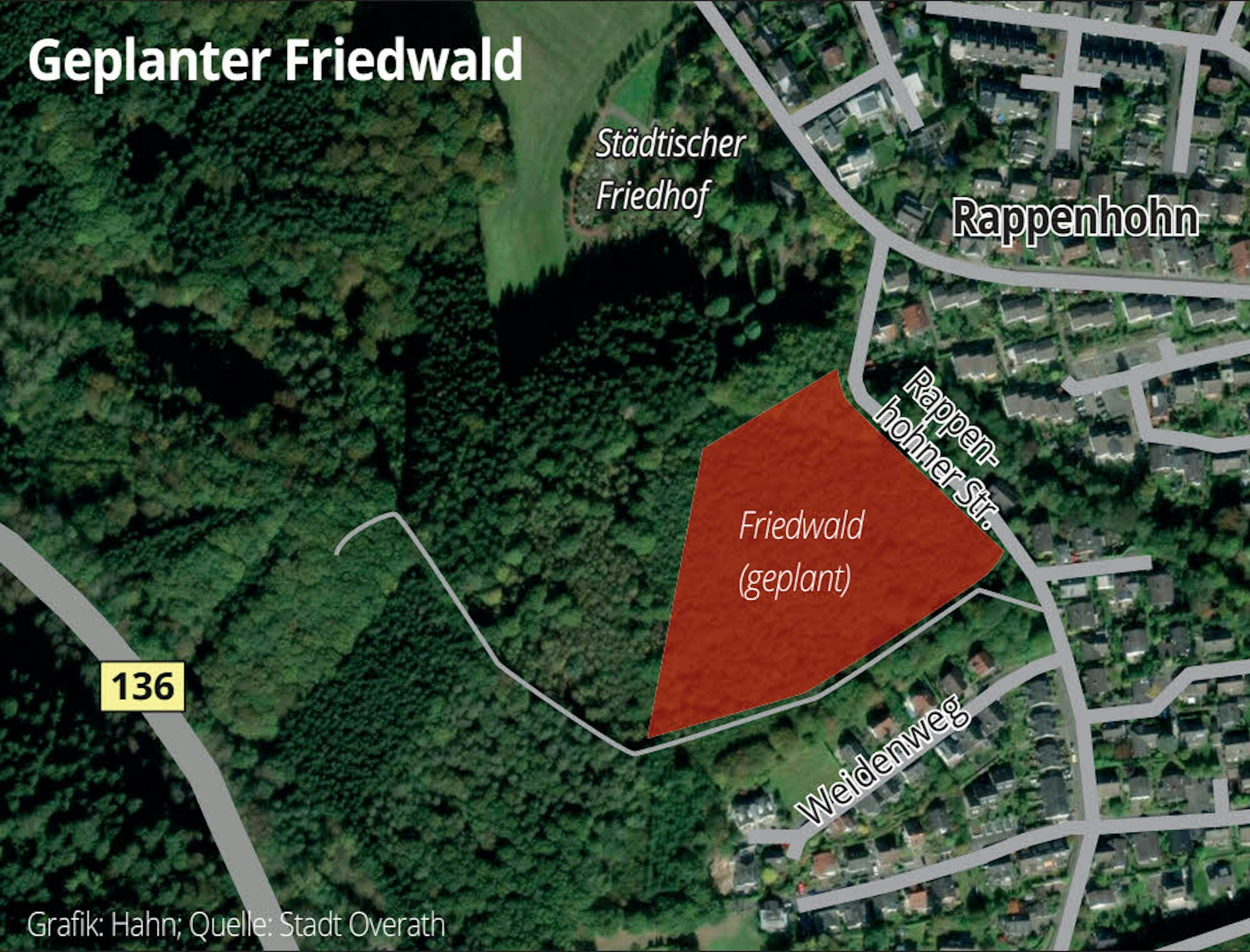 Overath – Die Stadt Overath will unterhalb des Friedhofs Rappenhohn einen Begräbniswald anlegen, um damit dem Wunsch zahlreicher Bürger nach alternativen Bestattungsformen entsprechen zu können. In der Nachbarschaft sorgt das Vorhaben allerdings teilweise für Stirnrunzeln. „Soll wirklich in unmittelbarer Nachbarschaft zu einem dicht besiedelten Wohngebiet mit vielen Kinder ein Waldfriedhof eingerichtet werden?“, fragt Anliegerin Eva Hast. Der Wald werde „intensiv für Spaziergänge auf dieser Aggerseite mit und ohne Kinder und Hund oder als abenteuerliche Spielfläche für Kinder aus der Nachbarschaft“ genutzt. Die Bewohner der näheren Umgebung seien „mittlerweile nachhaltig beunruhigt“.