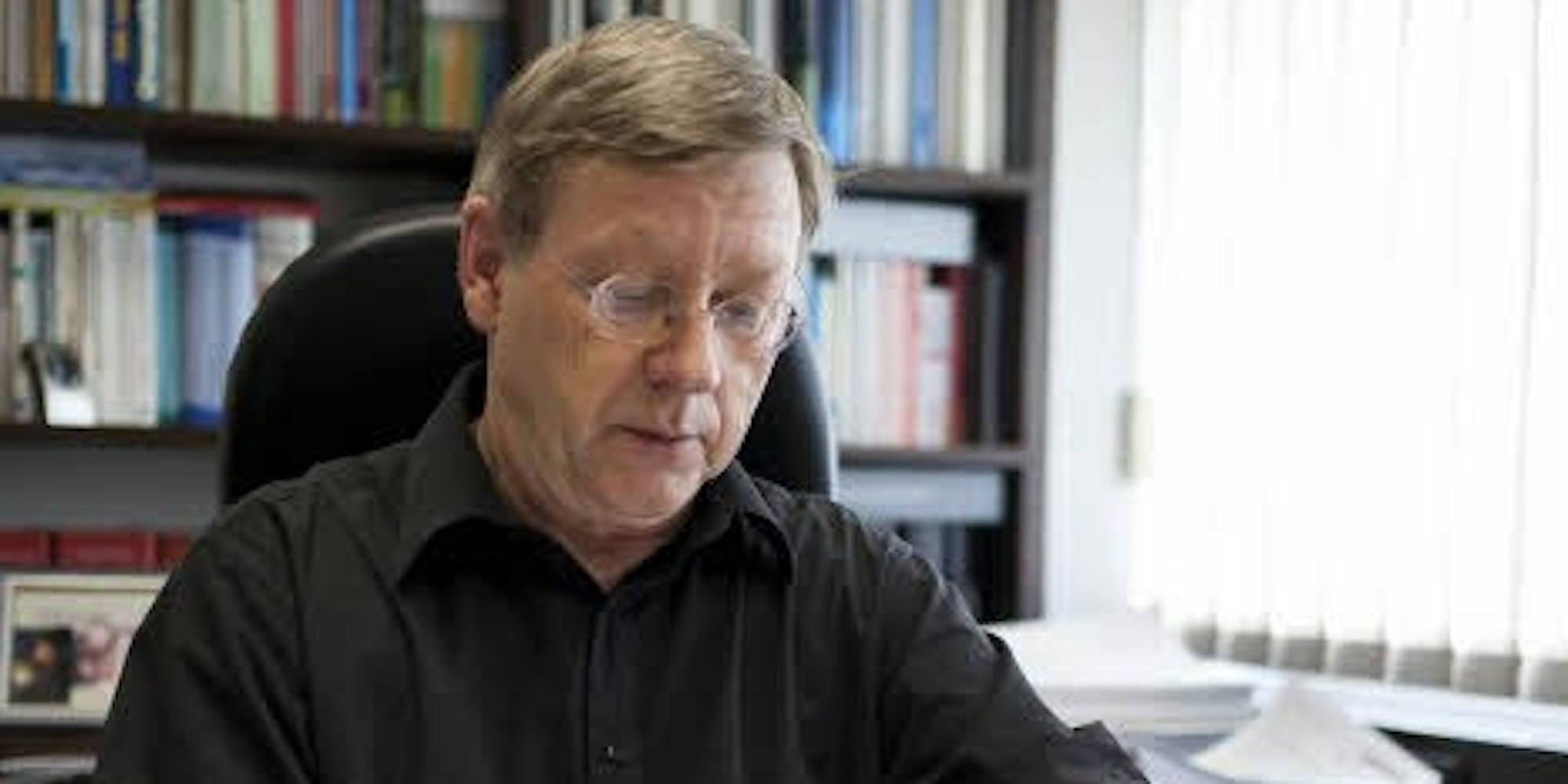 Amtsinhaber Andreas Heider (CDU) arbeitet an seinem Schreibtisch im Rathaus Akten durch.