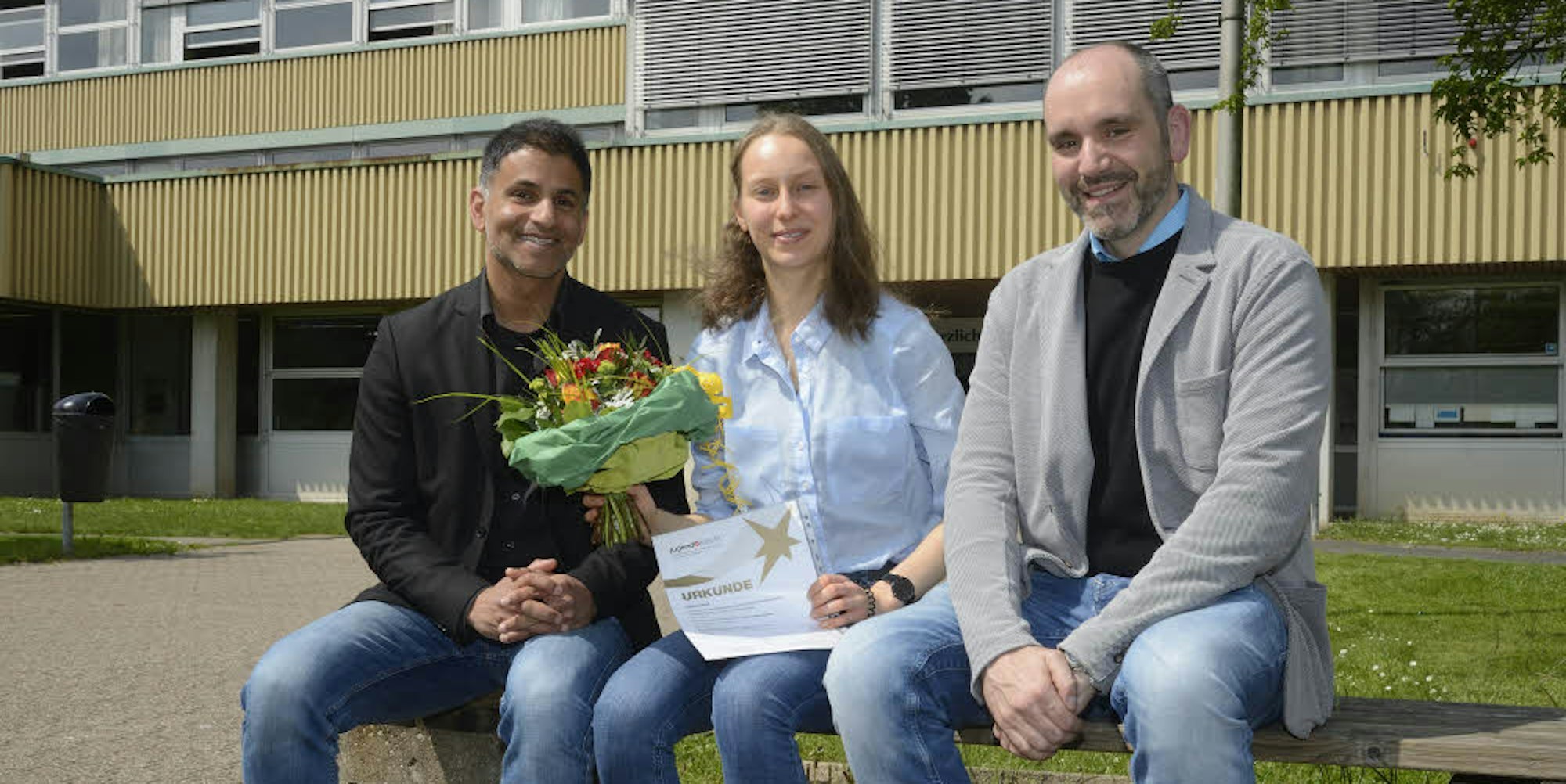 Gratulieren ihrer Schülerin Carolin Kohl: PKG-Schulleiter David Hubert (l.) und Chemielehrer Dr. Daniel Schiffbauer.