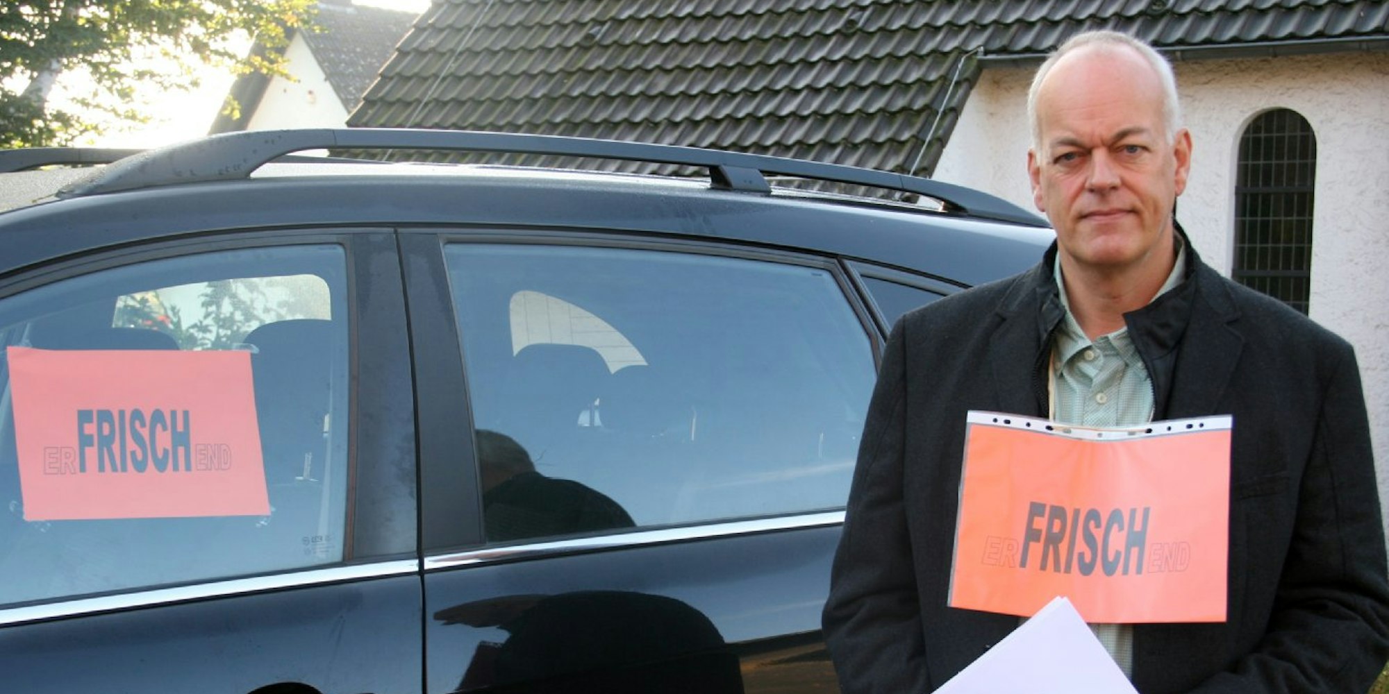 Boudewijn Kavelaars verteilte Zettel mit der Aufschrift „Erfrischend“, angelehnt an den Namen von Pfarrer Frisch.