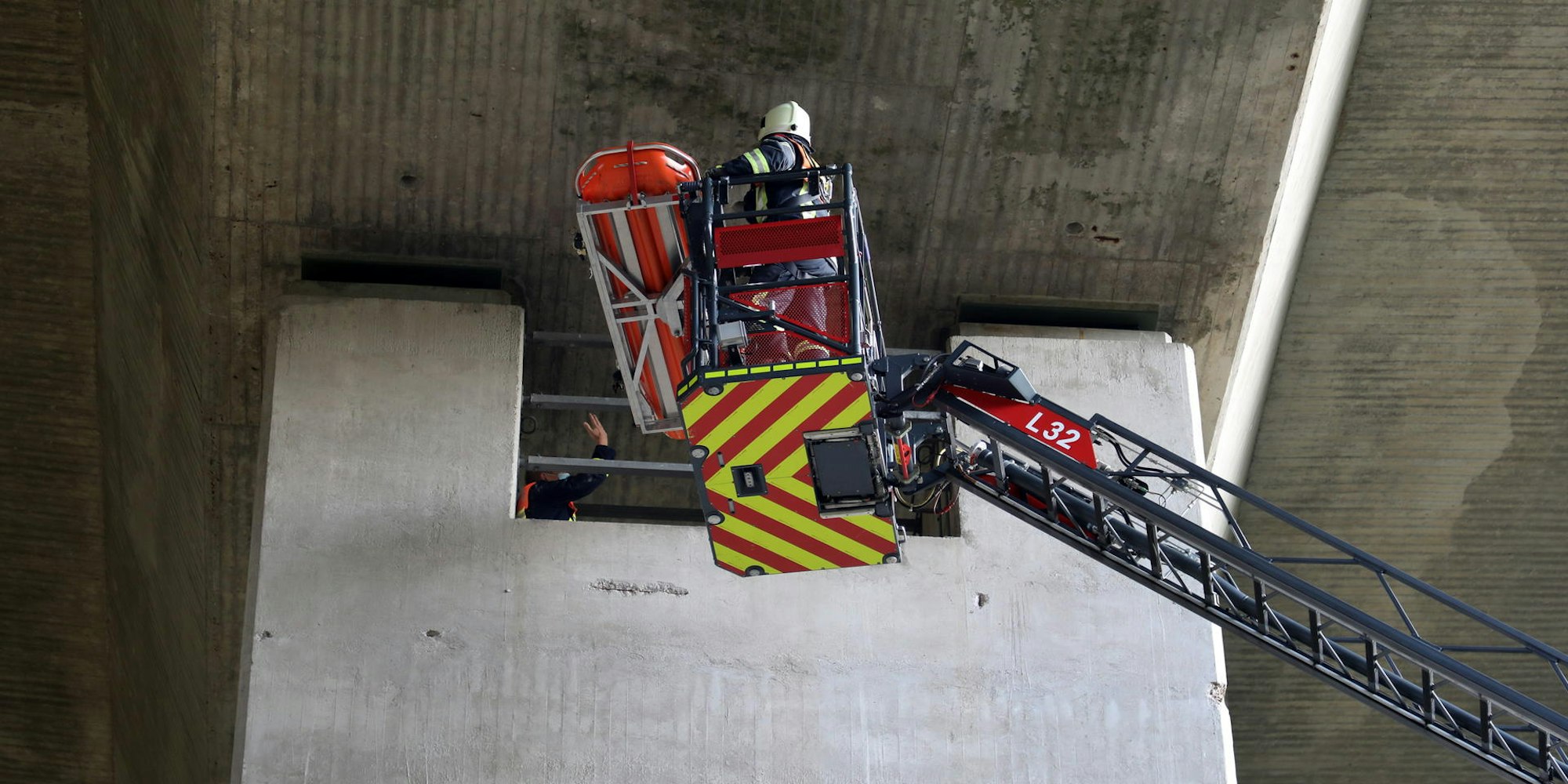 Seine Feuerwehrkollegen haben unterdessen den Verletzten vom Brückenpfeiler mit der Drehleiter hinunter zur Straße gebracht, der zweite „Verletzte“ sträubt sich, hat – wie er sagt – Höhenangst. Die Feuerwehrleiter lassen ihn gesichert an einem speziellen Rettungsseil die Leitern im Inneren des Brückenpfeilers hinuntersteigen.