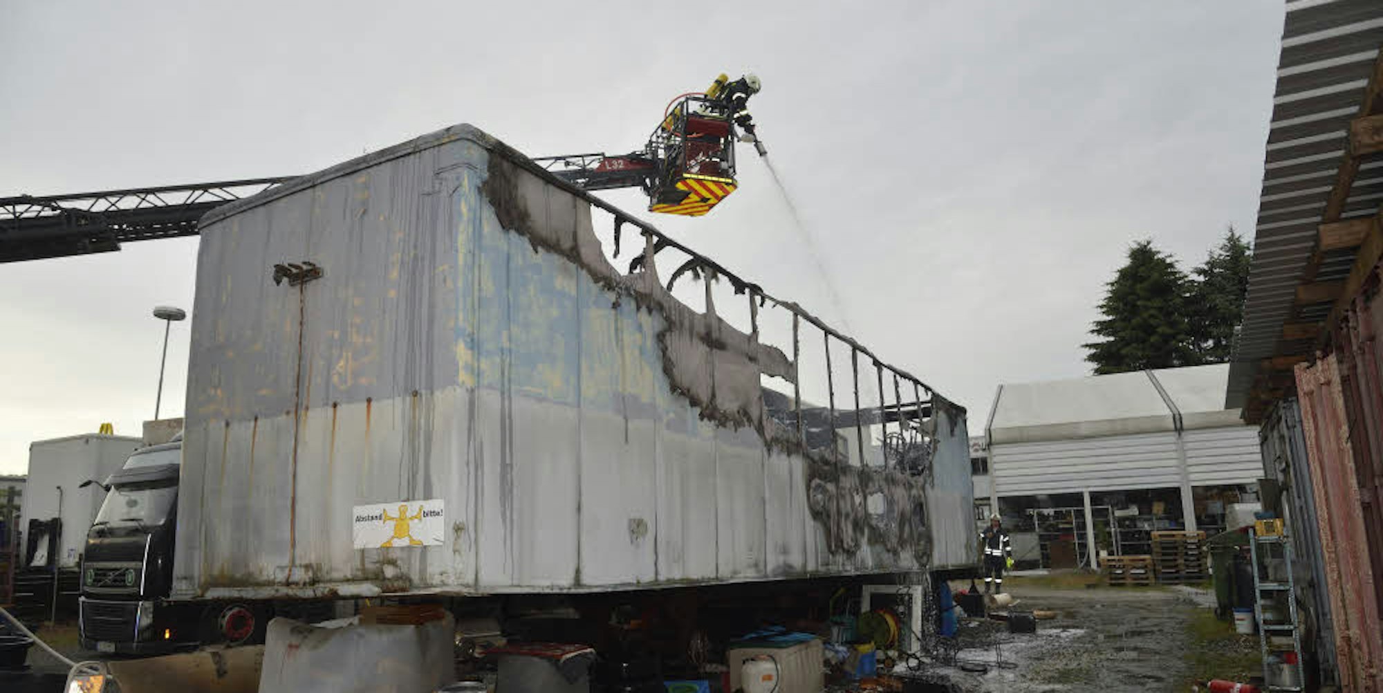 Es gelingt ihnen zu verhindern, dass die Flammen auf benachbarte Fahrzeuge oder Container überspringen. Ein nur wenige Meter entfernt abgestellter Sattelzug mit Zugmaschine bleibt unversehrt.
