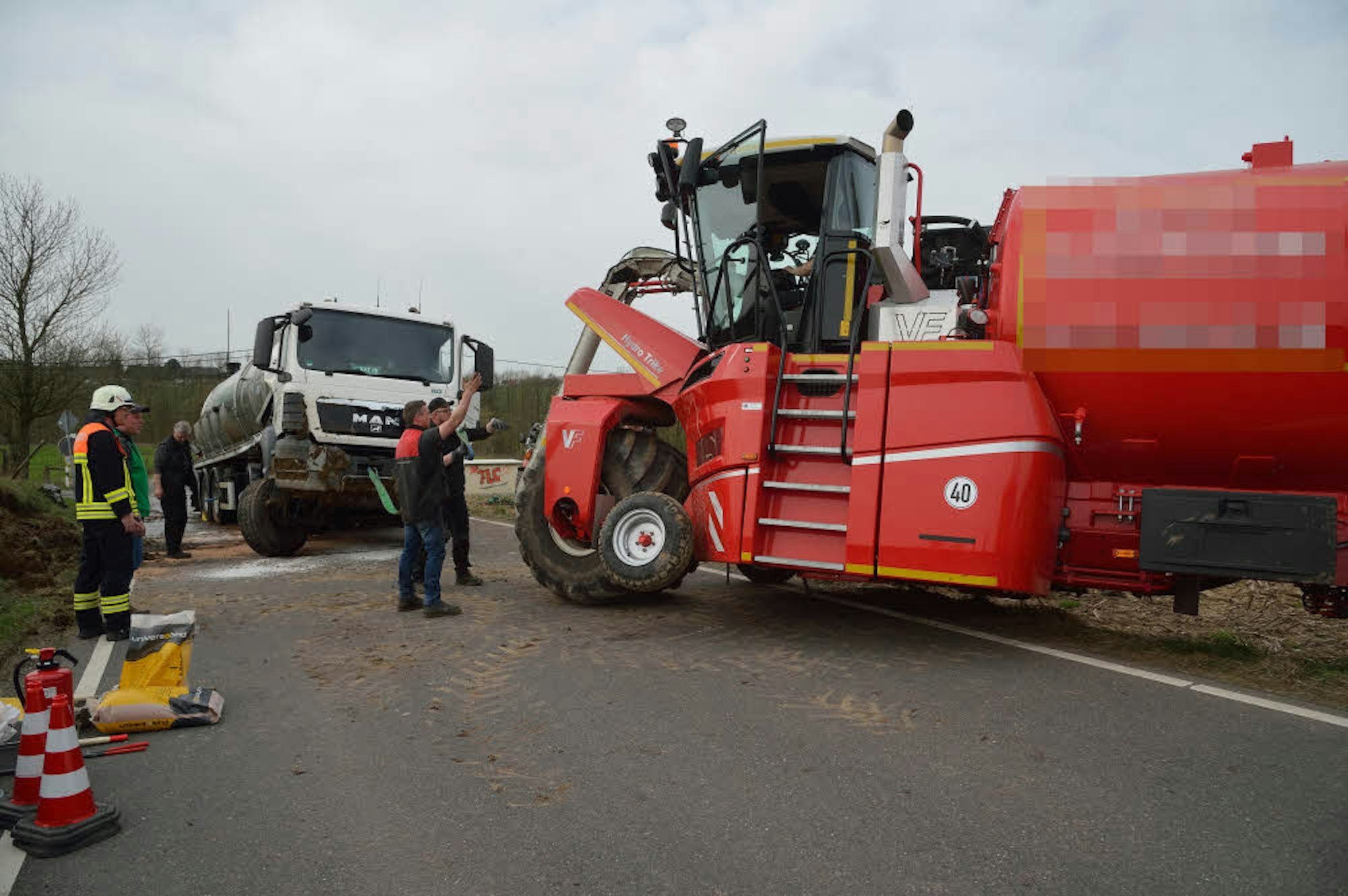 Der Gülletank des Aufliegers sei glücklicherweise nicht geborsten, berichtet Feuerwehrsprecher Marco Bücheler noch an der Unfallstelle. Erst beim Abpumpen der Gülle in einen anderen Tankzug muss ein Ventil geöffnet werden, durch das nach Schätzung der Polizei zwischen 100 und 200 Liter der flüssigen Fracht auf die Straße fließen. Auf dieser haben Mitarbeiter des Lohnunternehmers bereits Erdwälle errichtet, damit die Gülle nicht weiter die Landstraße hinunter in Richtung der nahen Brücke über die Autobahn laufen kann.
