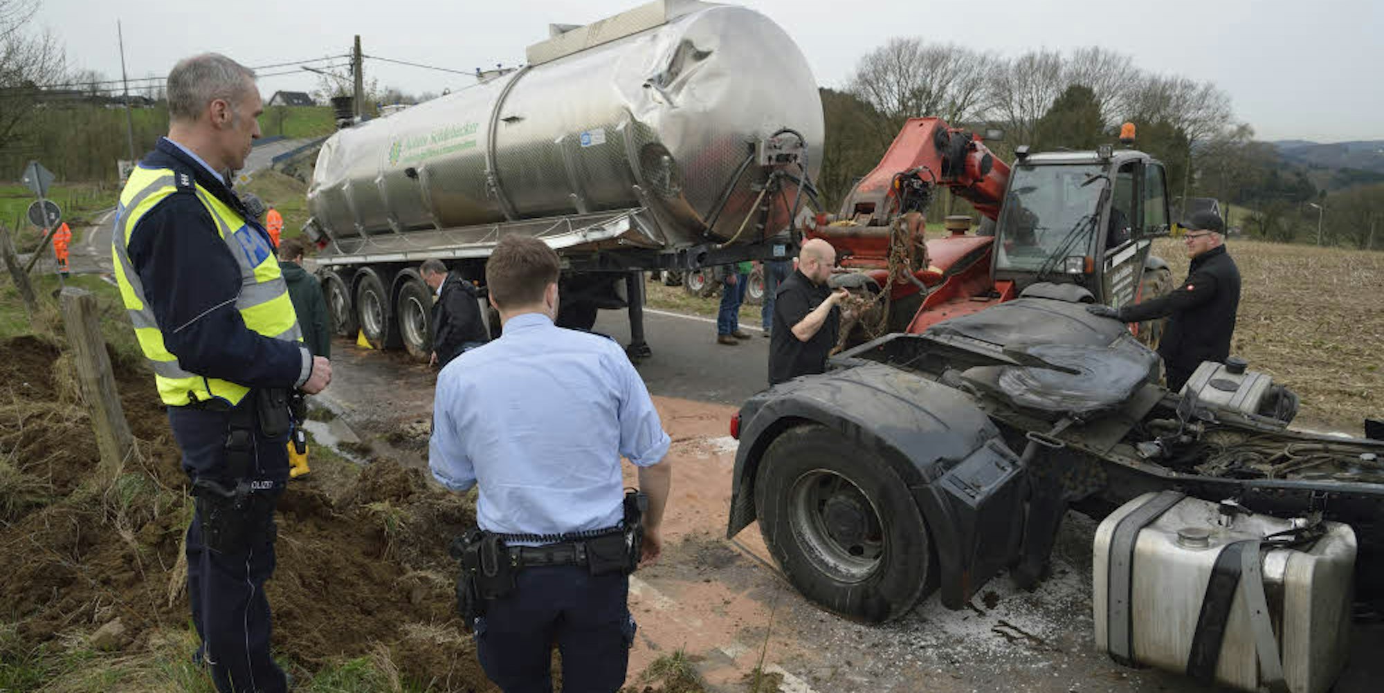 Overath – Da staunte selbst die Polizei: Nachdem Montagmorgen ein Tankzug mit 25 Tonnen Gülle auf der Landstraße zwischen Overath-Heiligenhaus und -Kreutzhäuschen in eine gefährliche Schieflage geraten war, rückte der Lohnunternehmer, dem der Tankzug gehörte, im Handumdrehen mit einem Großaufgebot an Spezialmaschinen zur Bergung des Unfallfahrzeugs an.
