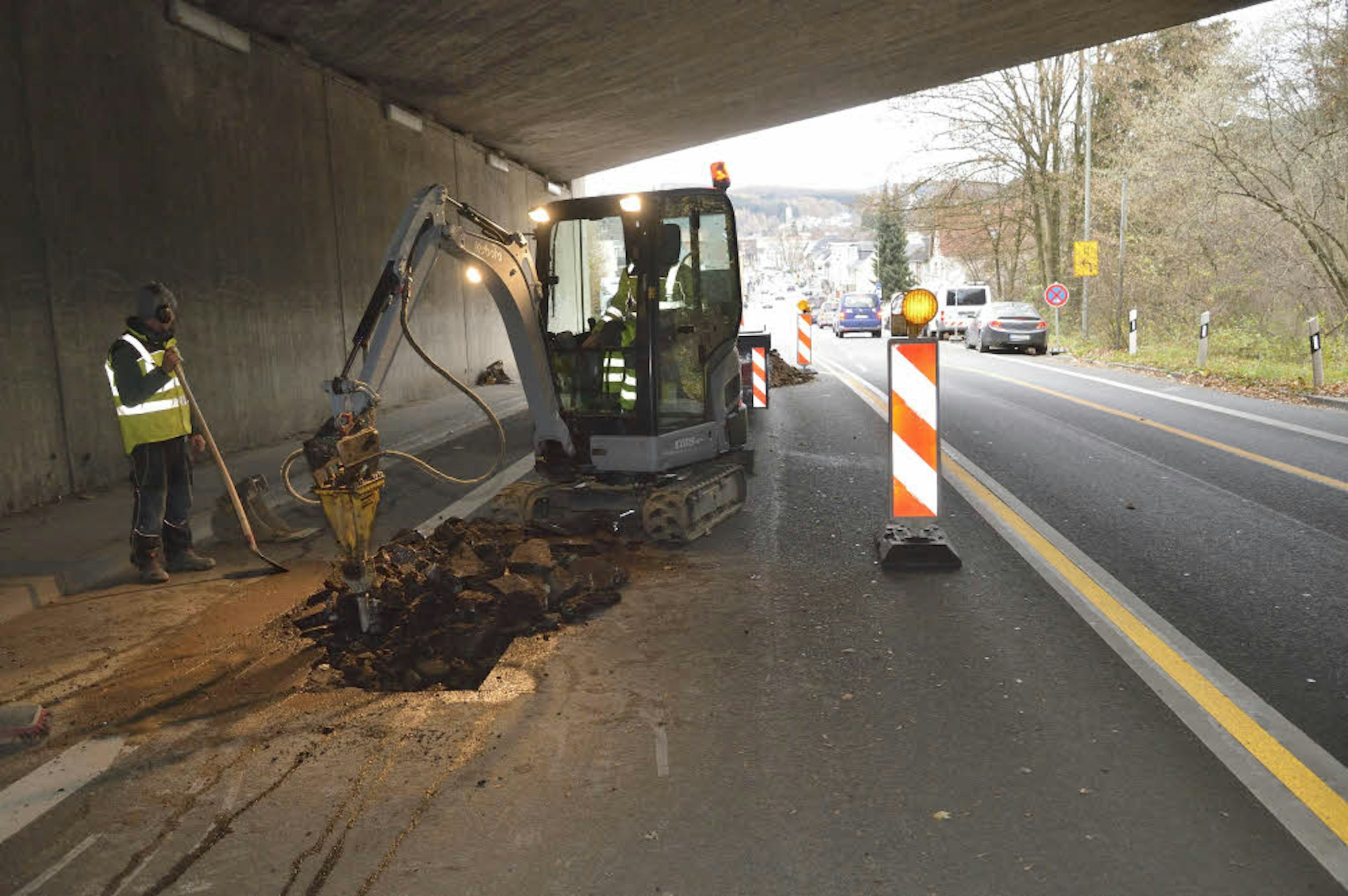 Im Auftrag von Straßen NRW wurde der Untergrund der L 136 unter der Autobahnbrücke in Untereschbach untersucht.