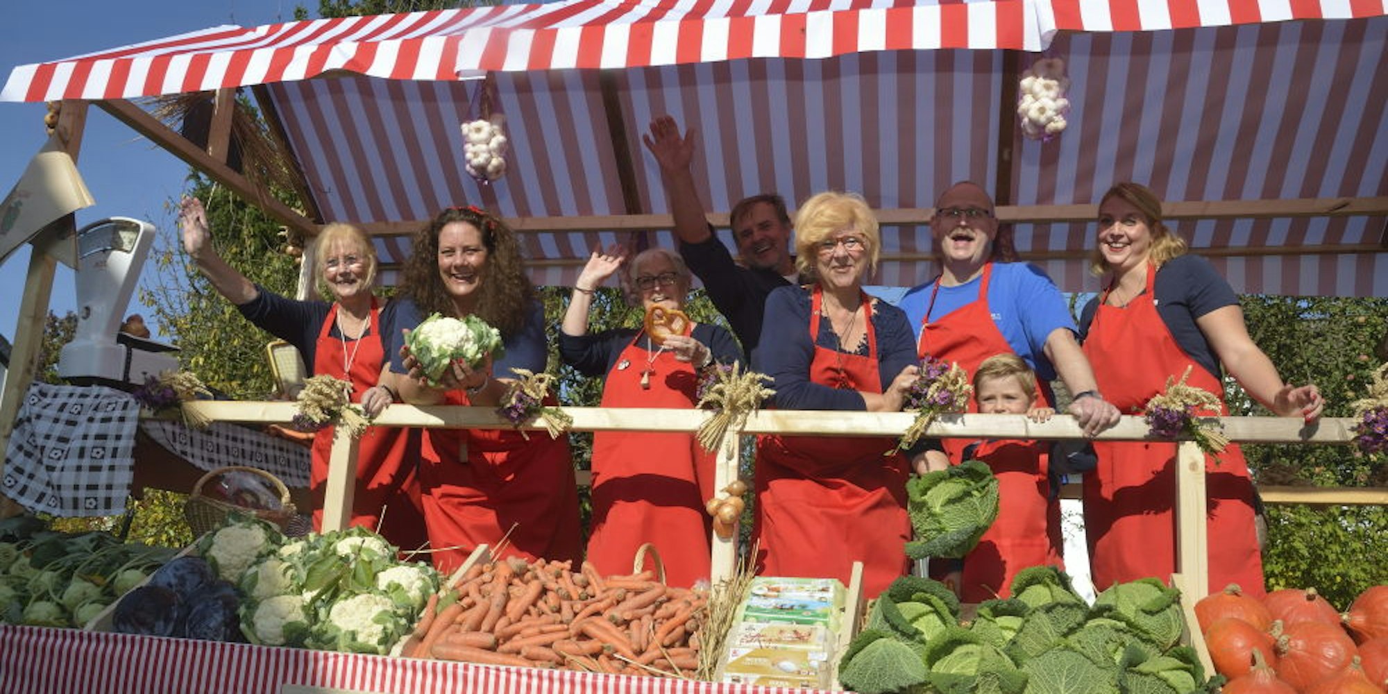 Beste Laune bei bestem Wetter auf dem Erntezug: Blumenkohl und Mohrrüben gab es auf diesem Wagen.