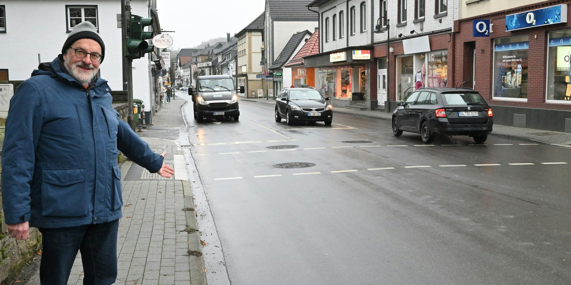 Overath – Heinrich Pfennings steht an der Straßenecke und gestikuliert in Richtung Hauptstraße. Besser gesagt, in Richtung des Bürgersteigs, den er für viel zu eng geraten hält. Genau wie auch die Fahrbahnen der Hauptstraße zwischen der Einmündung Probsteistraße und dem Autohaus Kuhl. „Auf der Fahrbahn fühlen sich die Radfahrer von den Autos bedrängt, und auf dem Bürgersteig ist viel zu wenig Platz für Fußgänger und Radfahrer“, sagt Pfennings. Man müsse teilweise als Fußgänger schon auf die Fahrbahn treten, wenn eine Person mit Kinderwagen entgegenkomme. Immer wieder, hat der 67-Jährige beobachtet, komme es deshalb zu gefährlichen Situationen auf Fahrbahn und Bürgersteigen.