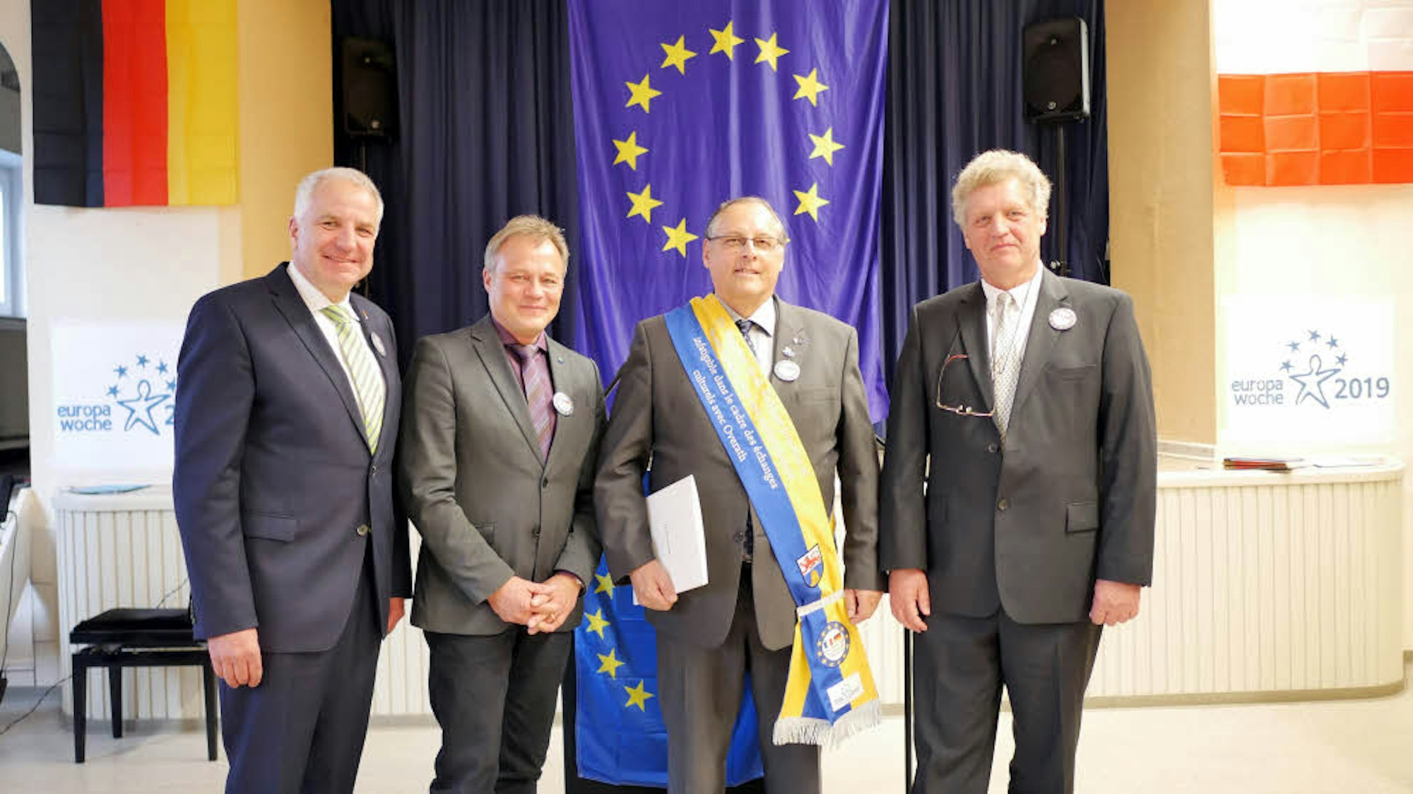 Stellvertretend für „Les amis d’Overath“ wurde Philippe Jourdan aus Pérenchies mit einer besonderen Schärpe, die mit den Wappen der Partnerstädte versehen war, geehrt. Dazu betonte der Landtagsabgeordnete Rainer Deppe (CDU): „Europa für den Kopf reicht nicht, wir brauchen Europa im Herzen.“