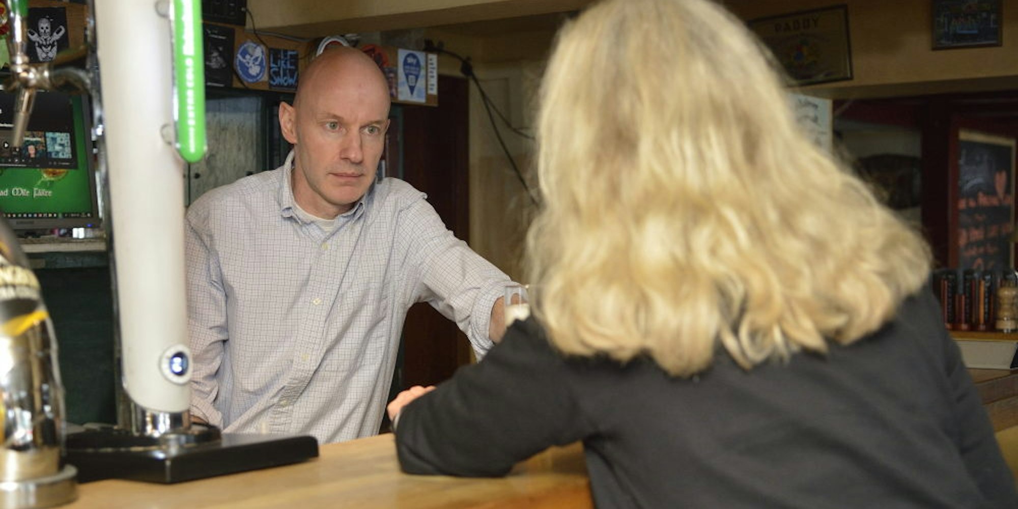Aufmerksam hört Pub-Inhaber Diarmaid Cotter der Besucherin zu. Die Szene ist während der Schulung des Burscheider Vereins Frauen-Zimmer entstanden.
