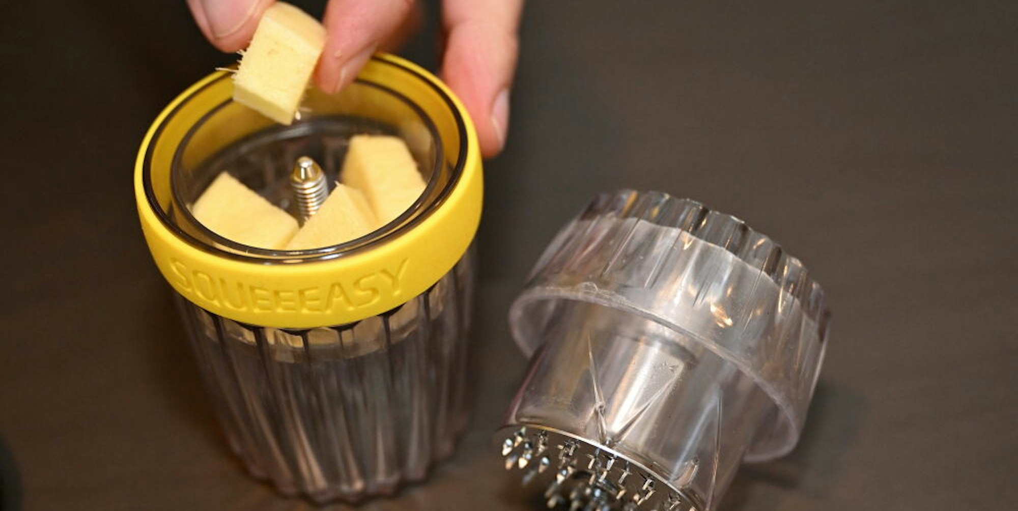 Mit dem „Squeeeasy“ soll es ganz einfach sein, puren, frischen Ingwersaft zu erhalten: Den Ingwer mit oder ohne Schale in das kleine Gerät füllen, das Oberteil drehen – schon läuft der Saft aus den Ingwerstücken. Ingwer habe 160 gute Inhaltsstoffe, sagt Unger, die dem Körper auf vielfältige Weise guttäten.