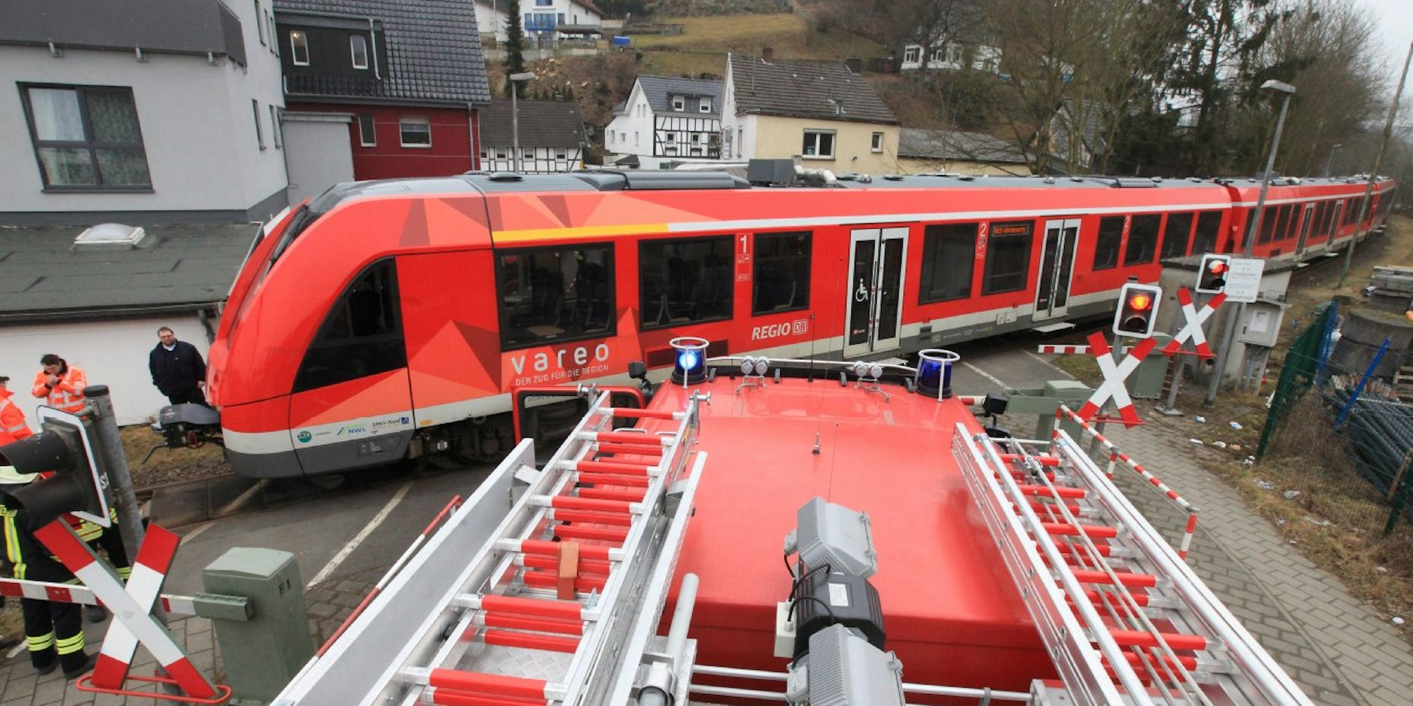 Overath – Vergleichsweise glimpflich ist am Donnerstagmorgen ein Verkehrsunfall zwischen einem Lastwagen mit Anhänger und der Regionalbahn 25 verlaufen. Am Bahnübergang Dr.-Ringens-Straße streifte die Bahn den Anhänger des Lasters. Gegen 9.07 fuhr nach bisherigen Erkenntnissen der Polizei ein 25-jähriger Lastwagenfahrer aus Polen mit seinem Fahrzeug über den Bahnübergang. Aufgrund des Fahrzeugrückstaus von der Einmündung zur Hauptstraße, stand der Anhänger mit dem Heck auf den Gleisen. Dann schlug die Ampel an der Bahnschranke auf rot – die Halbschranken senkten sich.