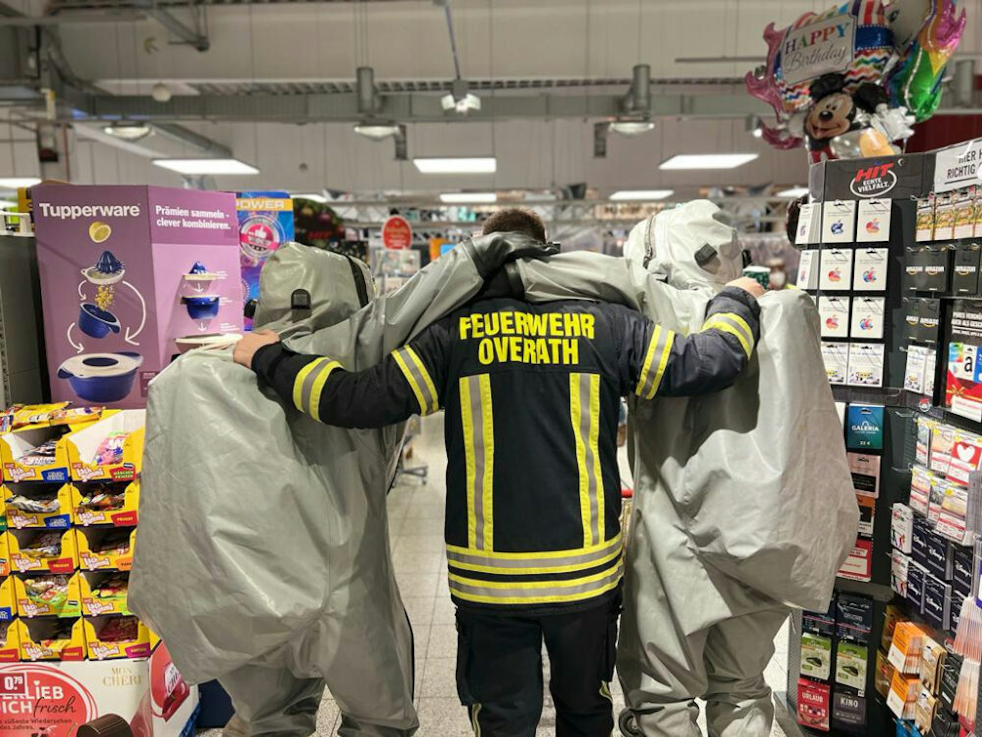 Feuerwehreinsatz in OverathMit Schutzanzug zum Einkaufen in den Supermarkt