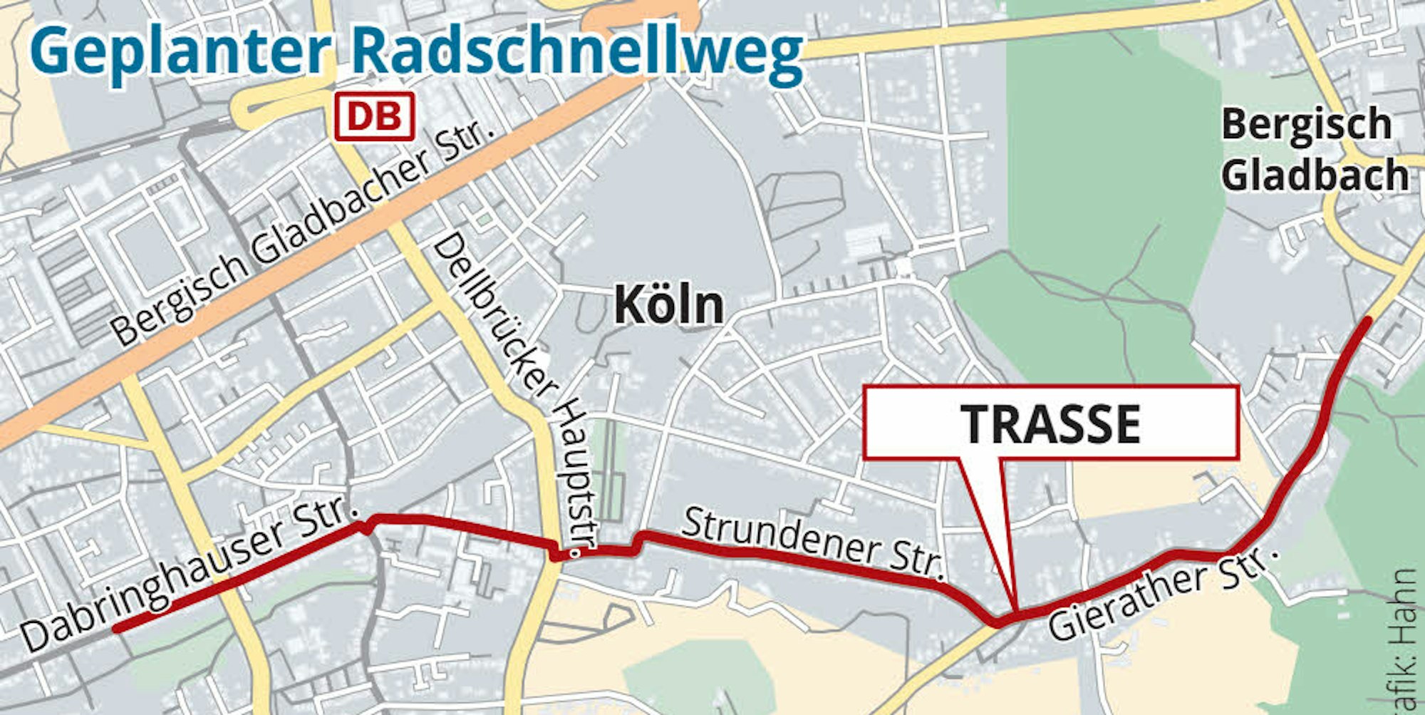 Die Initiative schlägt vor, den Weg auf vorhandenen Straßen durch Dellbrück verlaufen zu lassen. Er würde auf der Gierather Straße an der Stadtgrenze beginnen und über die Strundener Straße, die Hatzfeldstaße und die Dabringhauser Straße nach Holweide führen. Als Fahrradstraße müsse er etwa vier Meter breit sein und gesondert mit zwei Fahrspuren markiert werden, um Begegnungsverkehr – einschließlich Lastenfahrrädern – zu ermöglichen. Entlang des gesamten Verlaufs würden Radler Vorrang genießen und motorisierter Verkehr nur eingeschränkt zugelassen. Er räumte ein, dass an manchen Stellen Parkplätze am Straßenrand wegfallen könnten und schlägt den Anliegern vor, ihre Fahrzeuge in den Grundstückseinfahrten abzustellen. Diese Aussage erntete beim Publikum Gelächter.