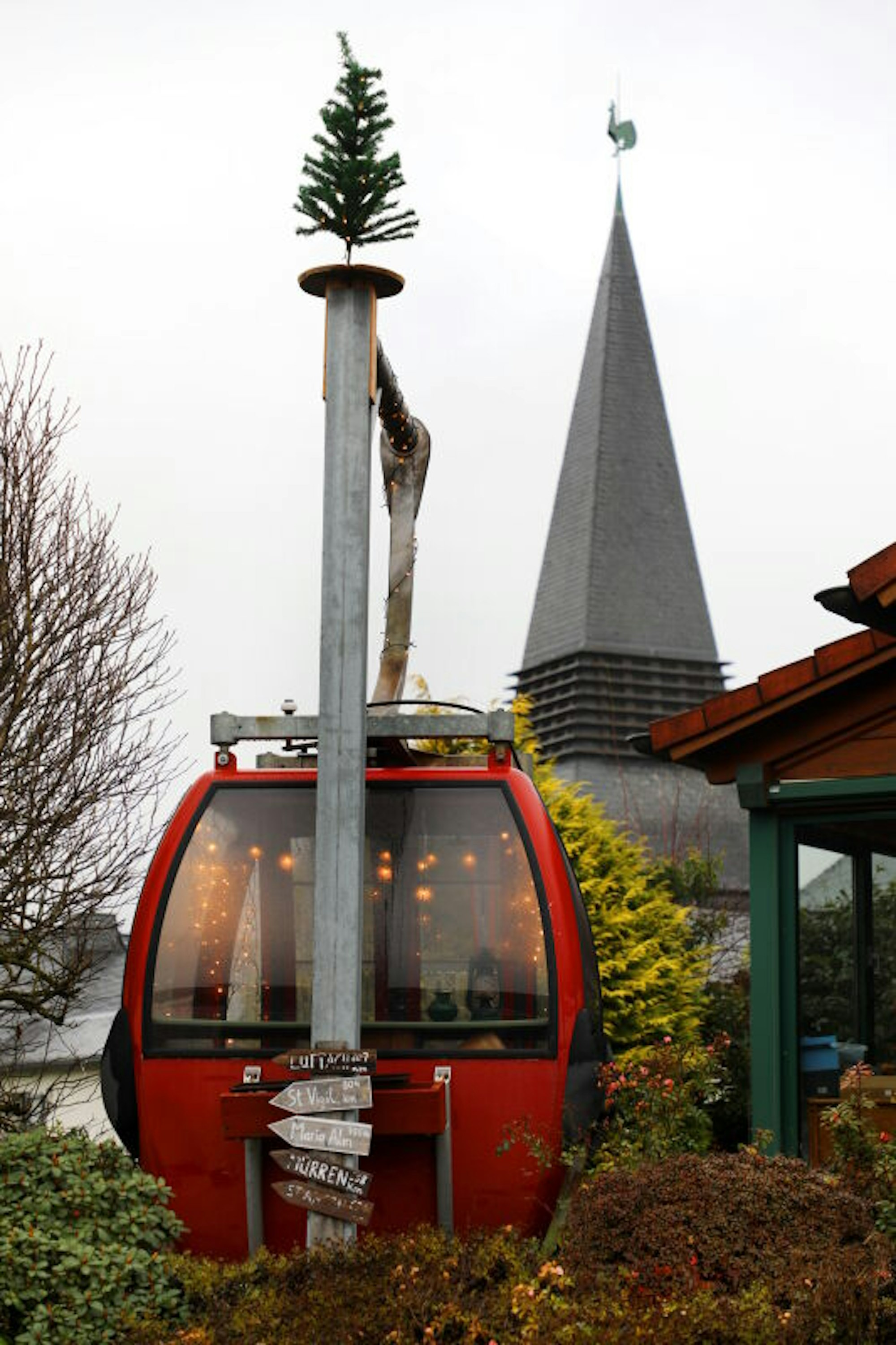 Eine ausrangierte Bergbahngondel in der Ortsmitte von Neschen.