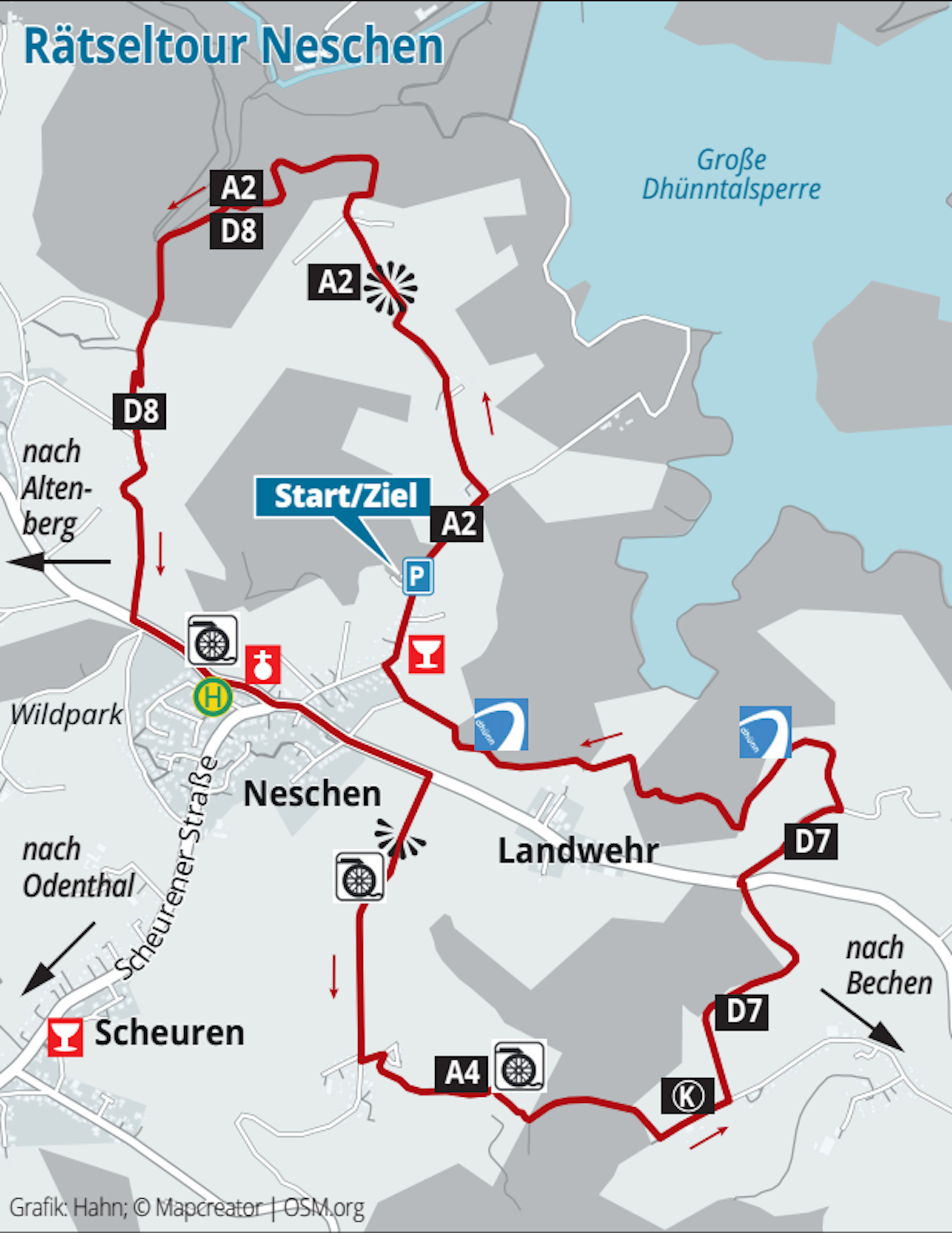 Start/Ziel: Wanderparkplatz Eichholzer Weg 42, 5159 Odenthal-Neschen. Anfahrt: Pkw: Aus Gladbachs Stadtmitte Odenthaler Straße Rtg. Odenthal bis Kreisverkehr Funkenhof, dort 1. Ausfahrt, dann links abbiegen und Straße bis Neschen folgen. An Kreuzung in Ortsmitte rechts und gleich wieder links in Eichholzer Weg bis Wanderparkplatz. ÖPNV: Vom Gladbacher S-Bahnhof mit Bus 432 bis Neschen Kirche.Länge/Dauer: 8,7 km, ca. 3 Std.