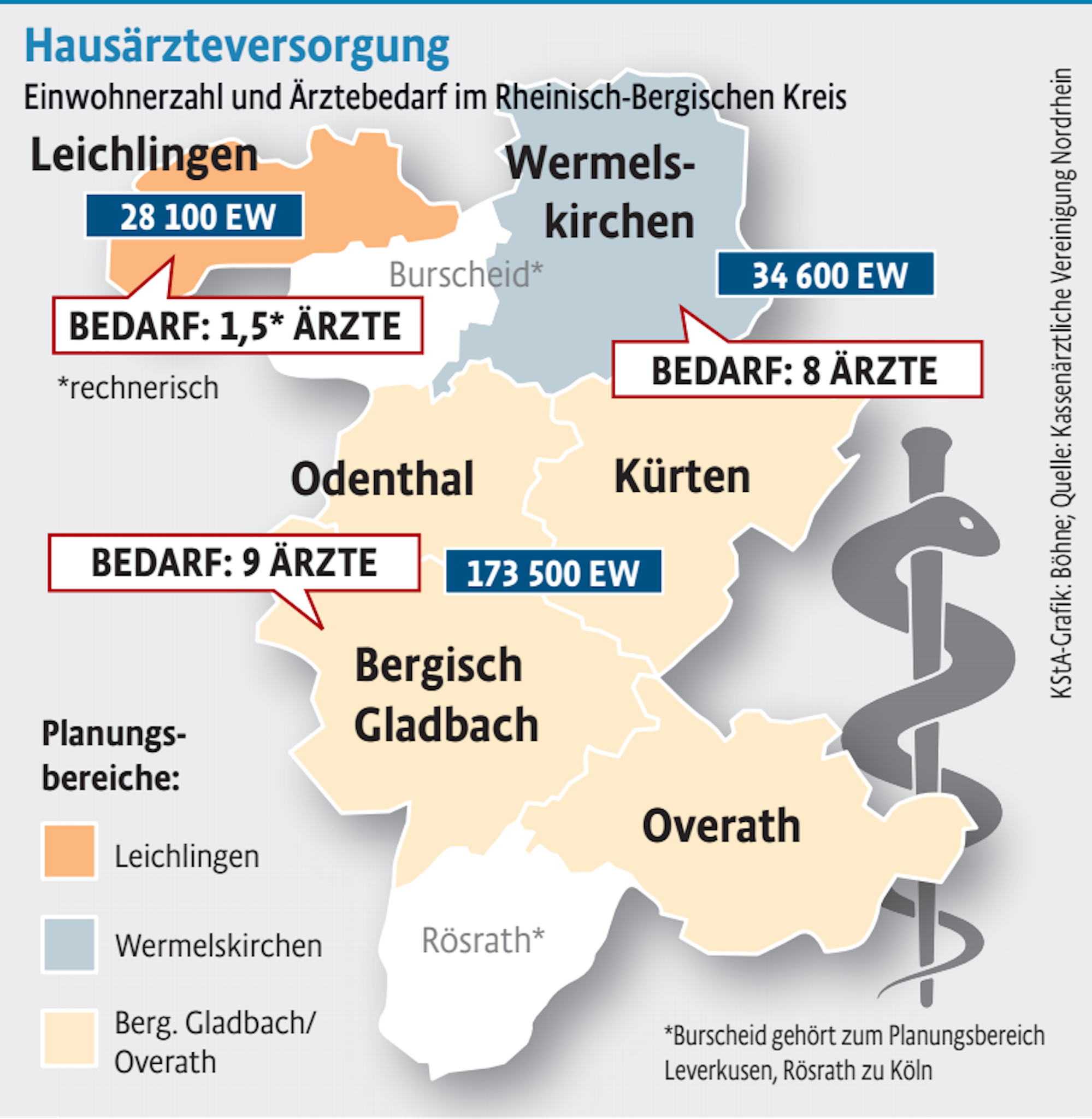In der Folge zählt bei den Hausärzten Burscheid zu Leverkusen und Rösrath zu Köln. Leichlingen und Wermelskirchen sind jeweils eigene Bereiche und der Rest vom Kreis – Bergisch Gladbach, Odenthal, Kürten und Overath – ist im Mittelbereich Bergisch Gladbach/Overath zusammengefasst.