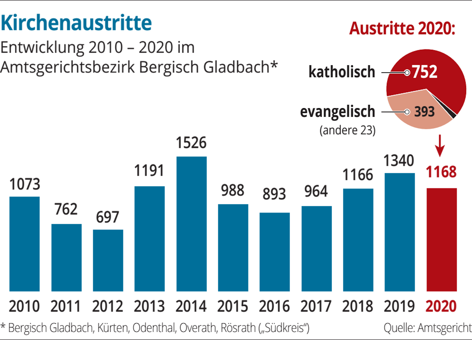 Rhein-Berg – Der Streit um die Aufarbeitung des Missbrauchsskandals im Erzbistum Köln hat im Rheinisch-Bergischen Kreis augenscheinlich bisher nicht zu einer zu einem massenhaften Austritt aus der katholischen Kirche geführt. Dies zeigt ein Blick auf die Entwicklung der Kirchenaustritte seit 2010, die das Bensberger Amtsgericht auf Anfrage veröffentlicht hat.