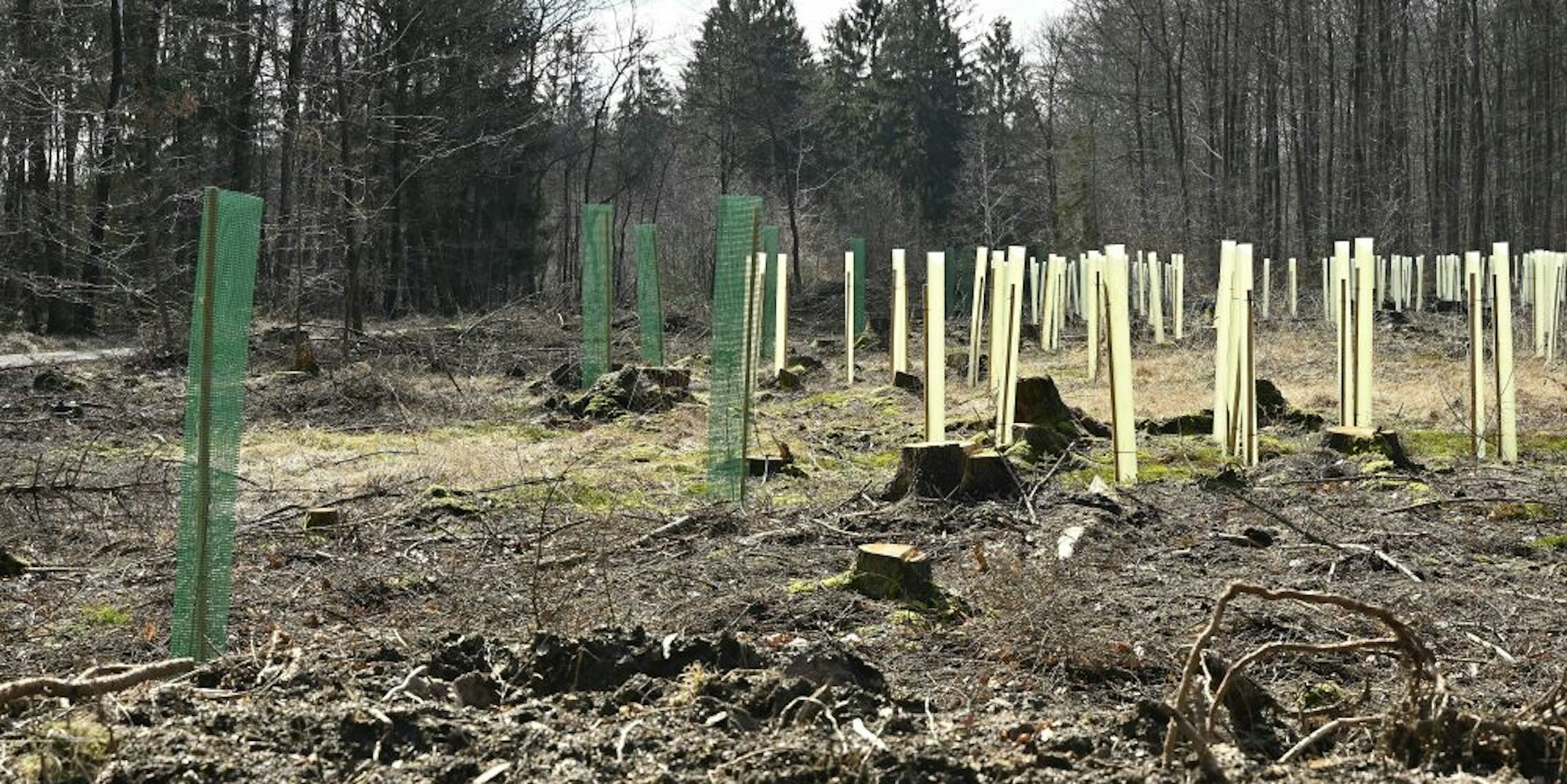 Die jungen Eichen werden mit Wuchshüllen vor Wildtieren geschützt.