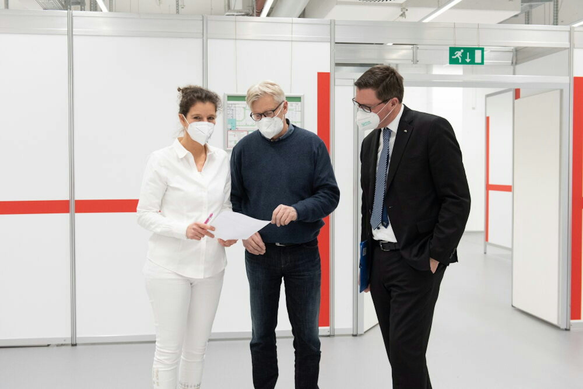 Beim Testlauf vor einigen Wochen: Landrat Stephan Santelmann (r.) mit Mitarbeitern im bereits seit Dezember startklaren Impfzentrum.
