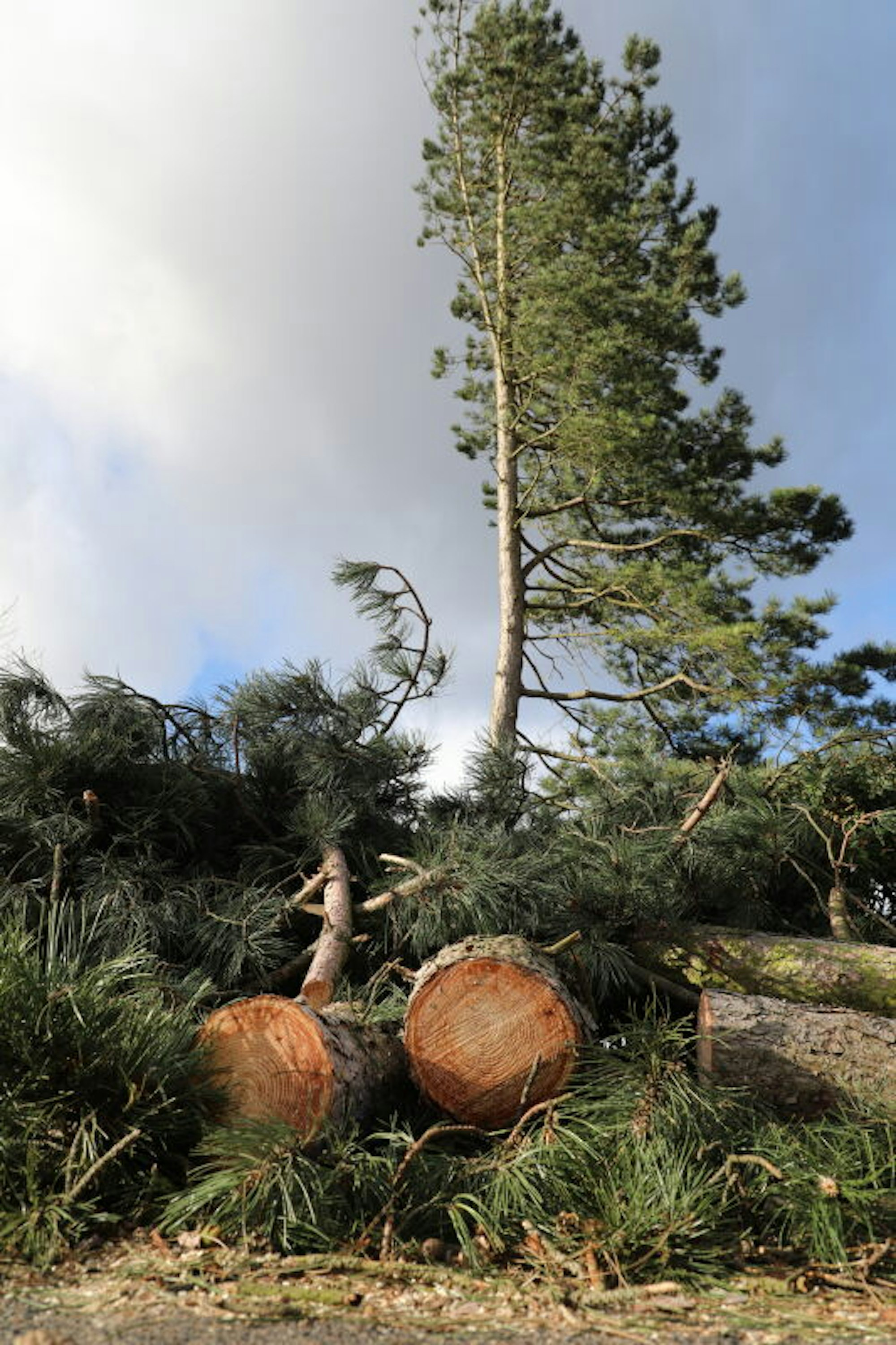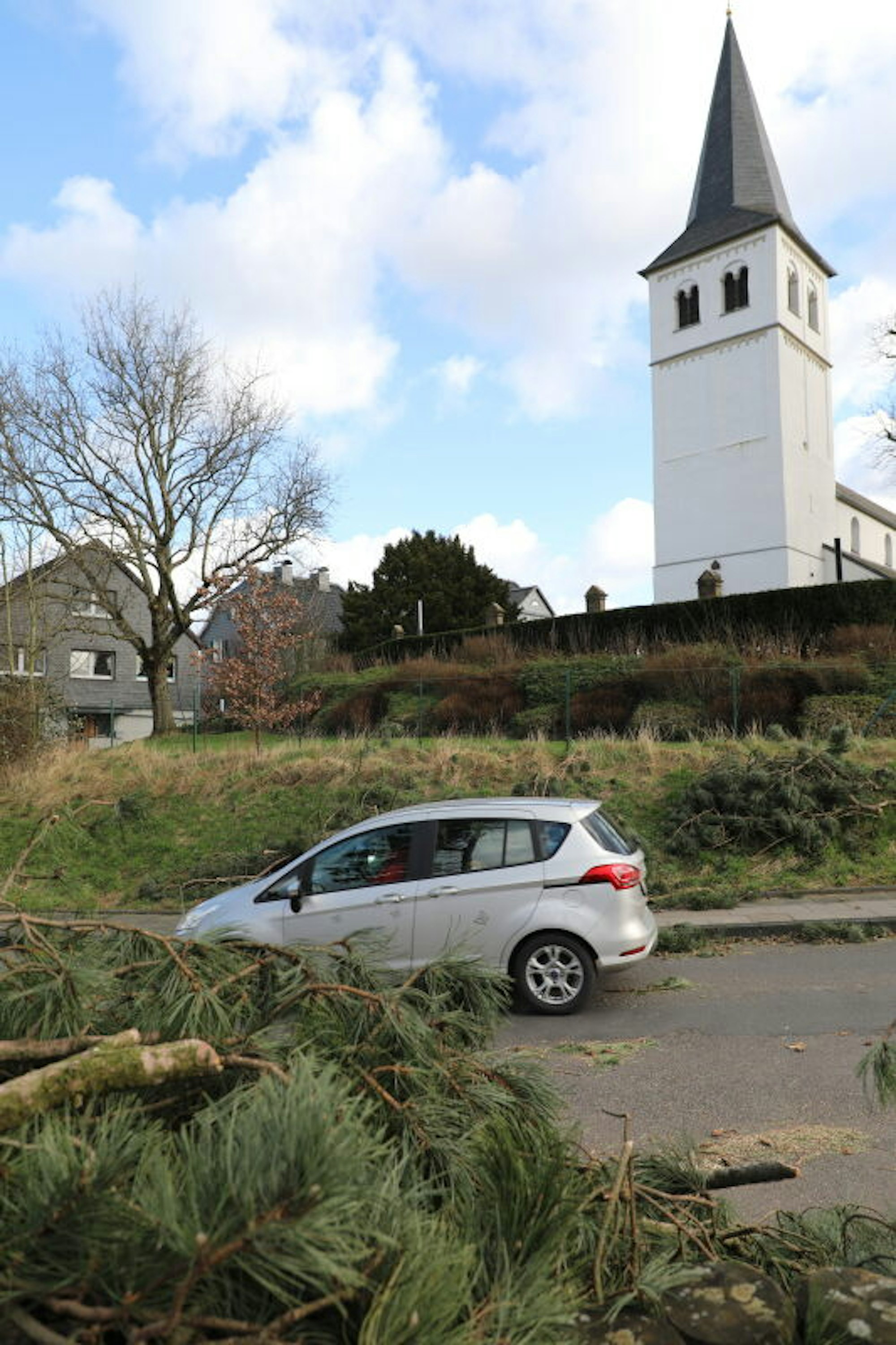 Teile dieses Baums auf dem Herkenrather Friedhof stürzten auf die Straße an der Kirche St. Antonius Abbas und mussten beseitigt werden.